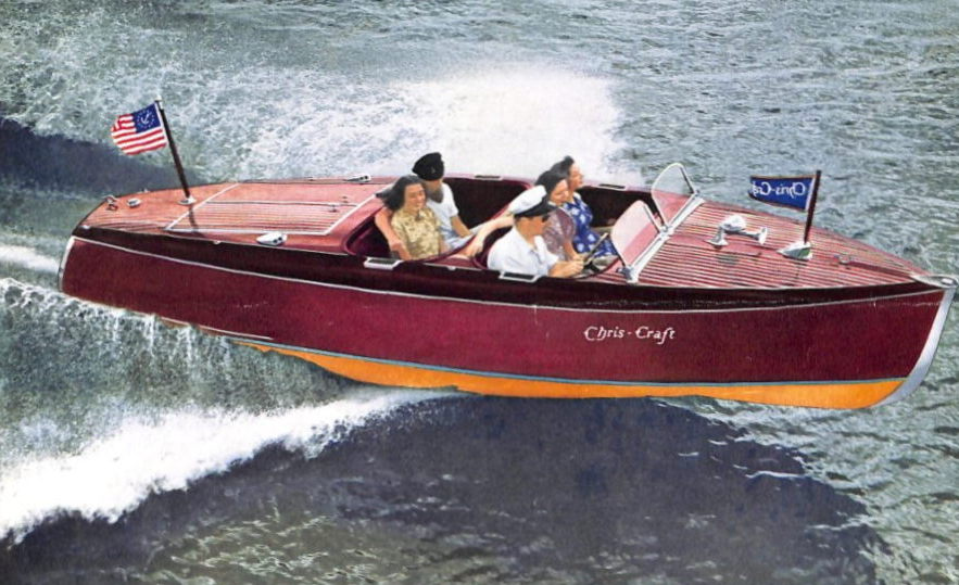 Unsere zweite Propeller-Leuchte. Sie ist etwas kleiner als die "RIVA DEL GARDA" und stammt aus einem ganz anderen Winkel der Welt. Der Bronze-Propeller trieb ein amerikanisches Chris Craft-Sportboot an und ist mit dem Geburtsort "Michigan" signiert. Chris Craft baut seit 1876 Boote, zunächst in Algonac, Michigan, heute in Sarasota, Florida. Seit im Jahr 1906 das erste sportliche "Runabout" auf den Markt kam, hat sich die US-Werft weltweit zu einer Ikone entwickelt. Bis 1971 wurden ausschließlich Holzboote gebaut. Die phantastischen Kreationen aus Mahagoni und Chrom cruisen seit mehr als 100 Jahren über die Seen und Meere in aller Welt. Nicht zuletzt Chris Craft-Boote waren es, die zur Inspiration für Carlo Riva wurden. Er baute ab 1949 ähnliche Boote in Italien.
