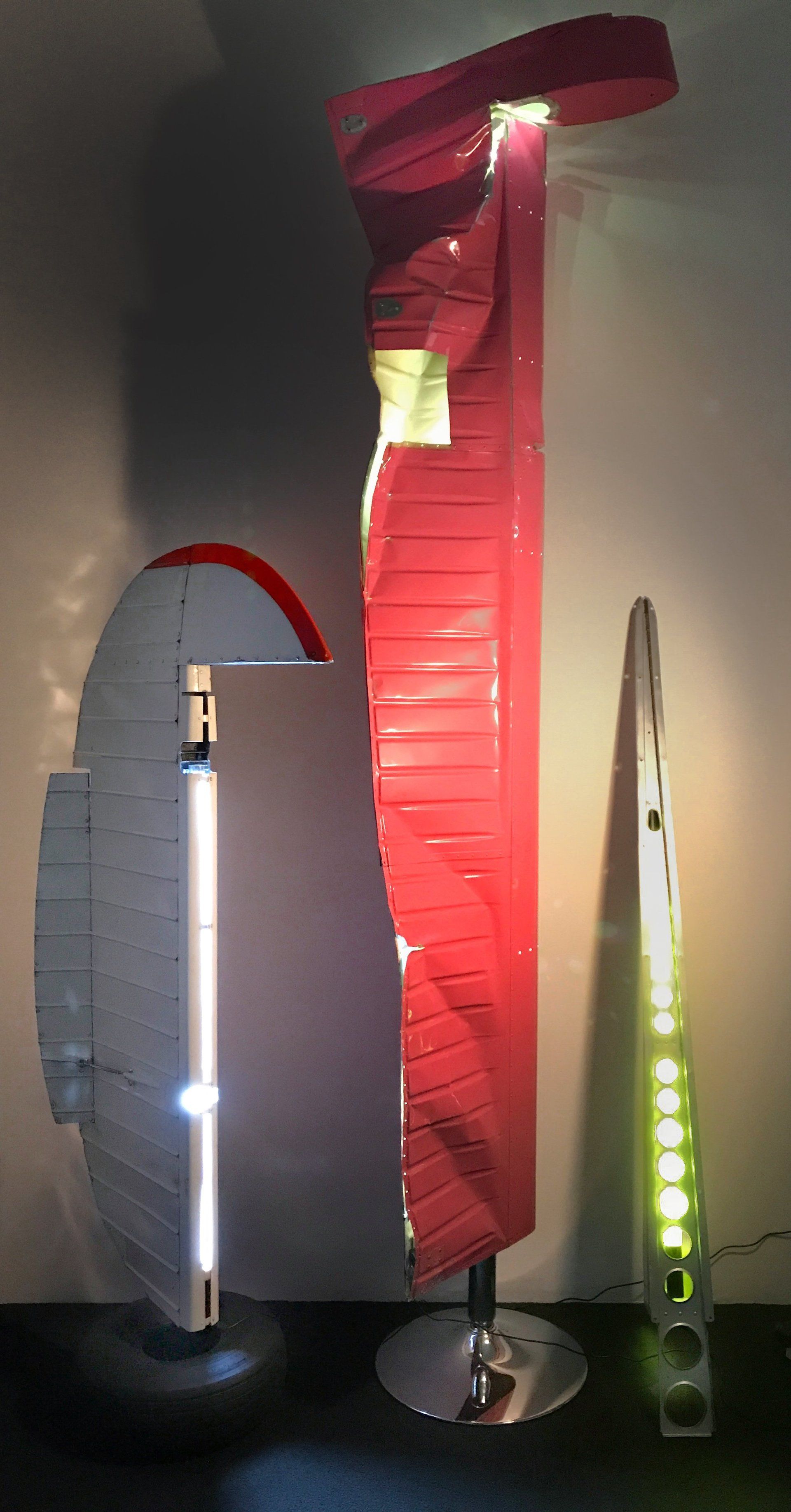 Das Flügelteil stammt von einem Piper-Sportflugzeug, ist pfeilschmal und sehr elegant. Wir haben es in der Original-Lackierung Cremeweiß mit ockerfarbenen Zierstreifen belassen. Alle scharfen Kanten haben wir handschmeichlerisch abgerundet und anschließend gebürstet. An diesen Stellen liegt das glänzende Flugzeugaluminium frei.