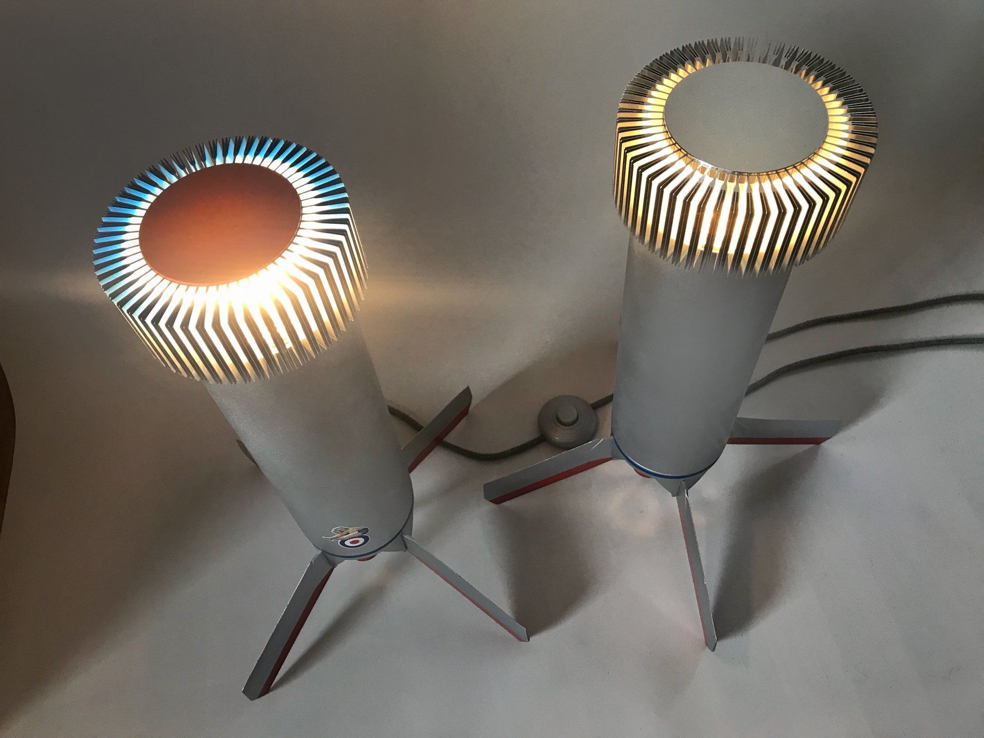 Als Stehleuchte darf sie nun am Boden "gut Wetter machen". Sorgfältig gesandstrahlt und neu lackiert, steht sie auf den original erhaltenen (klappbaren) Leitwerken und wurde im Innern mit einer E27-Fassung versehen. Sie haben daher bei der Auswahl des Leuchtmittels alle Freiheiten. Auf den Boden wirft die "Meteor" durch die vier Triebwerksdüsen hindurch ein interessantes Lichtmuster aus vier Ringen – je einer pro Triebwerk. So als ob die Rakete im nächsten Moment abheben würde.