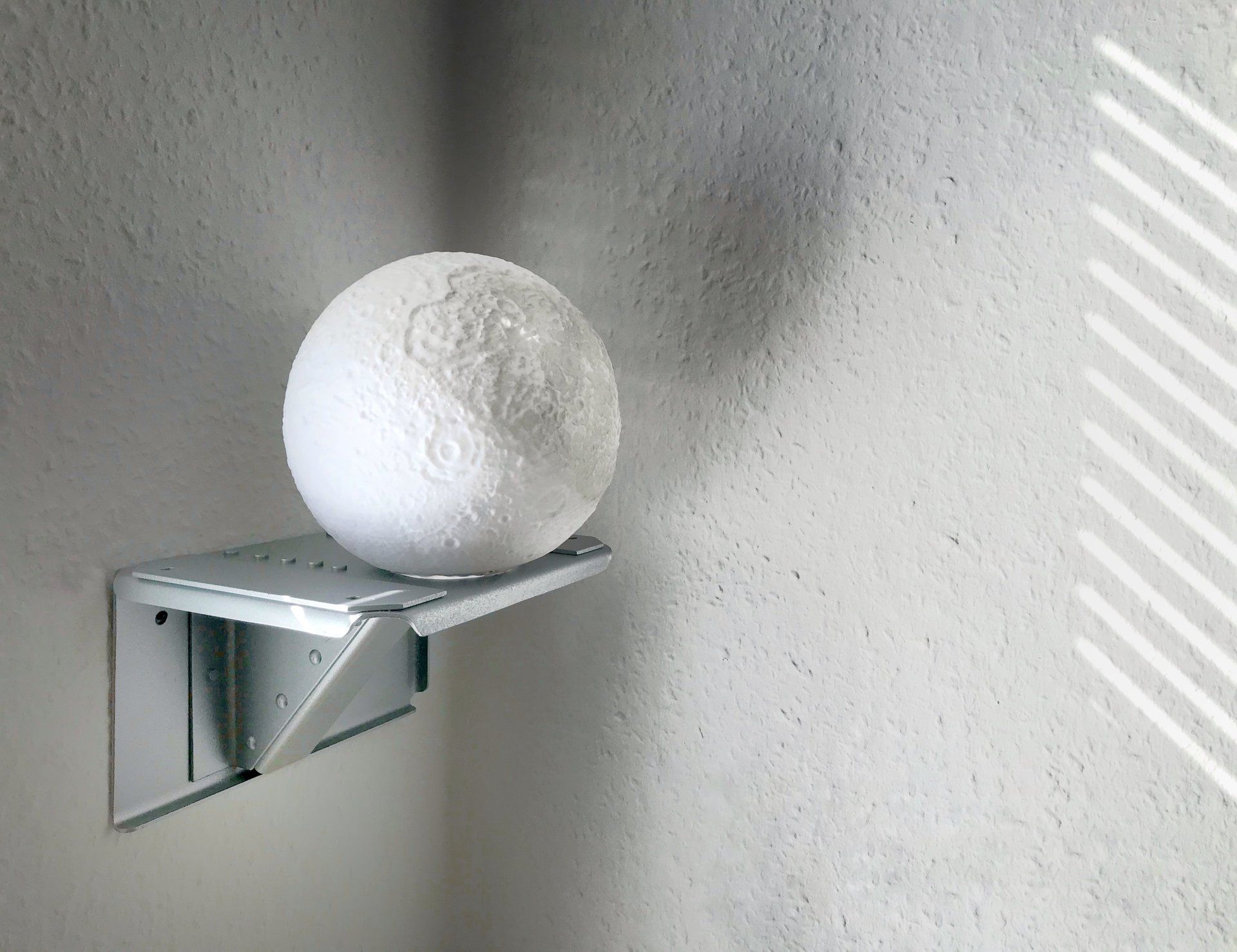 Unsere Halterung aus leichtem Flugzeug-Aluminium ist keine 20 Zentimeter breit und hat oben ein Loch. Damit ist sie wie gemacht für diese ungewöhnliche Leuchte. Die Kugel ist ein sehr detailliertes 3D-Modell unseres Mondes, das die Oberfläche des Erd-Satelliten in feinen und ertastbaren Reliefs abbildet. Der Mond leuchtet wahlweise in drei Farbvarianten – kaltweiß, warmweiß und gelblich. Die Helligkeit lässt sich stufenlos einstellen. Dies alles geschieht über einen einzigen, kleinen Druckknopf auf der Unterseite der Kugel. Die Leuchte hat einen eingebauten Akku und einen Micro-USB-Anschluss.