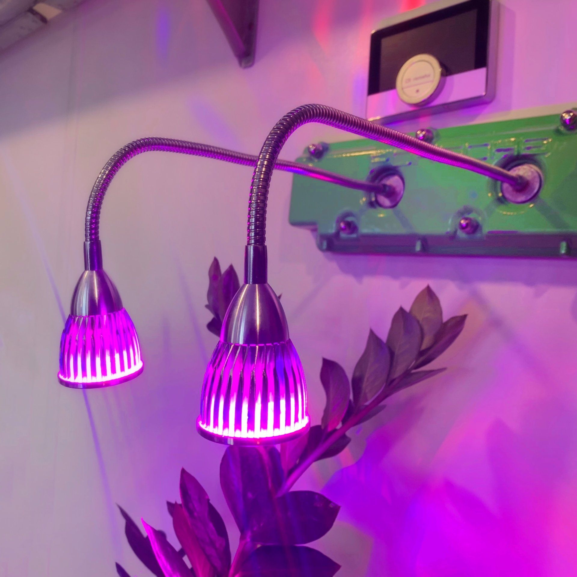 Der Ventildeckel eines klassischen Porsche 911 wird hier zur coolen Planzenleuchte. Er wurde sauber entölt und entlackt, dann pulverbeschichtet im klassischen Elfer-Grün, wie es auch bei den F-Modellen der 911er-Baureihe ab Werk zu haben war. So steht er da, mit zwei herausragenden LEDs aus gefrästem Aluminium, deren Edelstahl-Schwanenhälse frei in alle Richtungen gebogen werden können. Die beiden Leuchten leuchten in der typischen violetten Pflanzenfarbe, wie unsere stummen Florafreunde es so sehr lieben, um per Photosynthese aus Licht eine Rübe zu formen oder eben ein paar Stacheln.