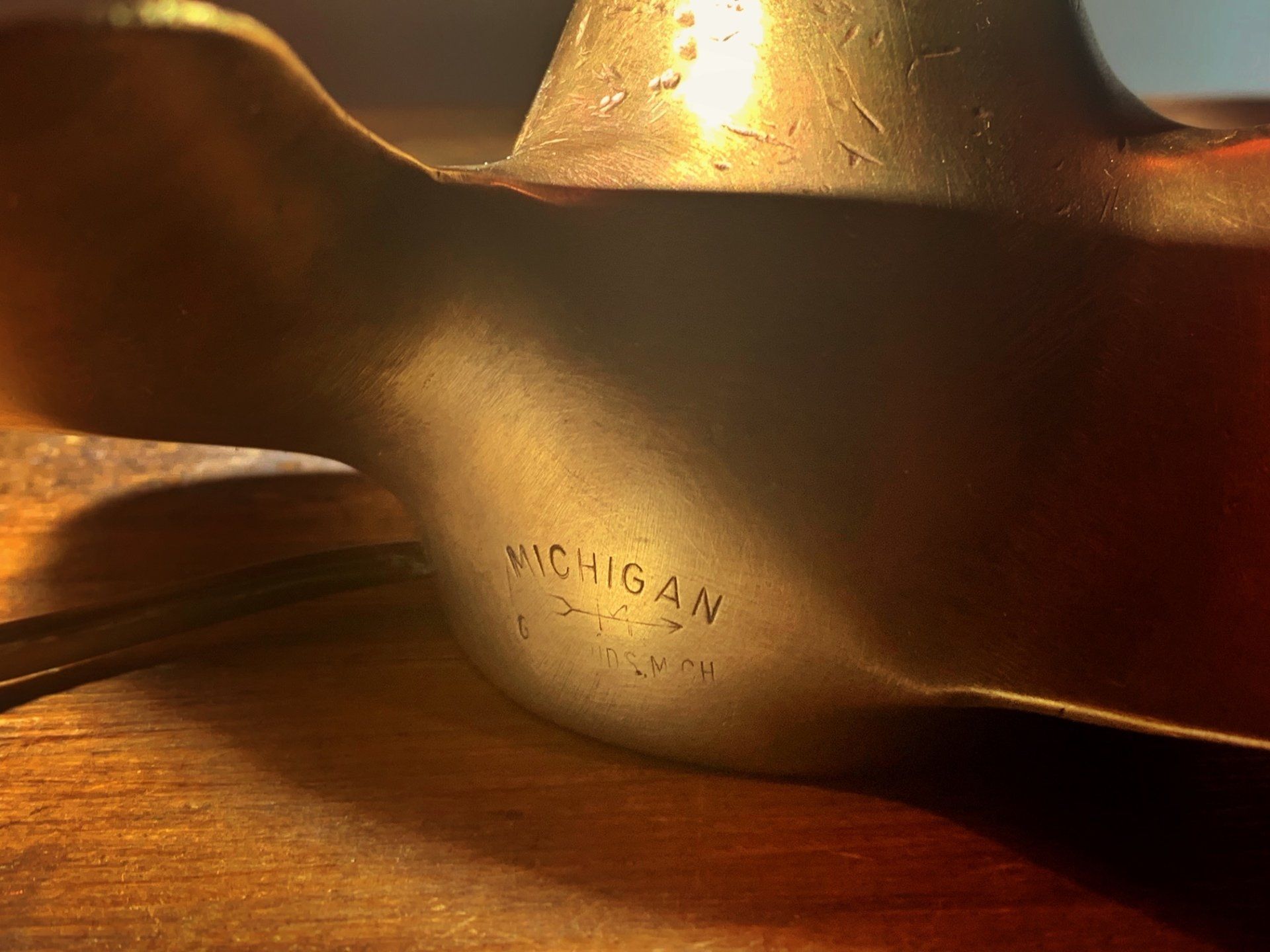 Unsere zweite Propeller-Leuchte. Sie ist etwas kleiner als die "RIVA DEL GARDA" und stammt aus einem ganz anderen Winkel der Welt. Der Bronze-Propeller trieb ein amerikanisches Chris Craft-Sportboot an und ist mit dem Geburtsort "Michigan" signiert. Chris Craft baut seit 1876 Boote, zunächst in Algonac, Michigan, heute in Sarasota, Florida. Seit im Jahr 1906 das erste sportliche "Runabout" auf den Markt kam, hat sich die US-Werft weltweit zu einer Ikone entwickelt. Bis 1971 wurden ausschließlich Holzboote gebaut. Die phantastischen Kreationen aus Mahagoni und Chrom cruisen seit mehr als 100 Jahren über die Seen und Meere in aller Welt. Nicht zuletzt Chris Craft-Boote waren es, die zur Inspiration für Carlo Riva wurden. Er baute ab 1949 ähnliche Boote in Italien.