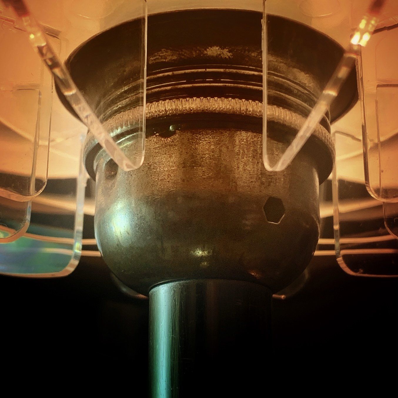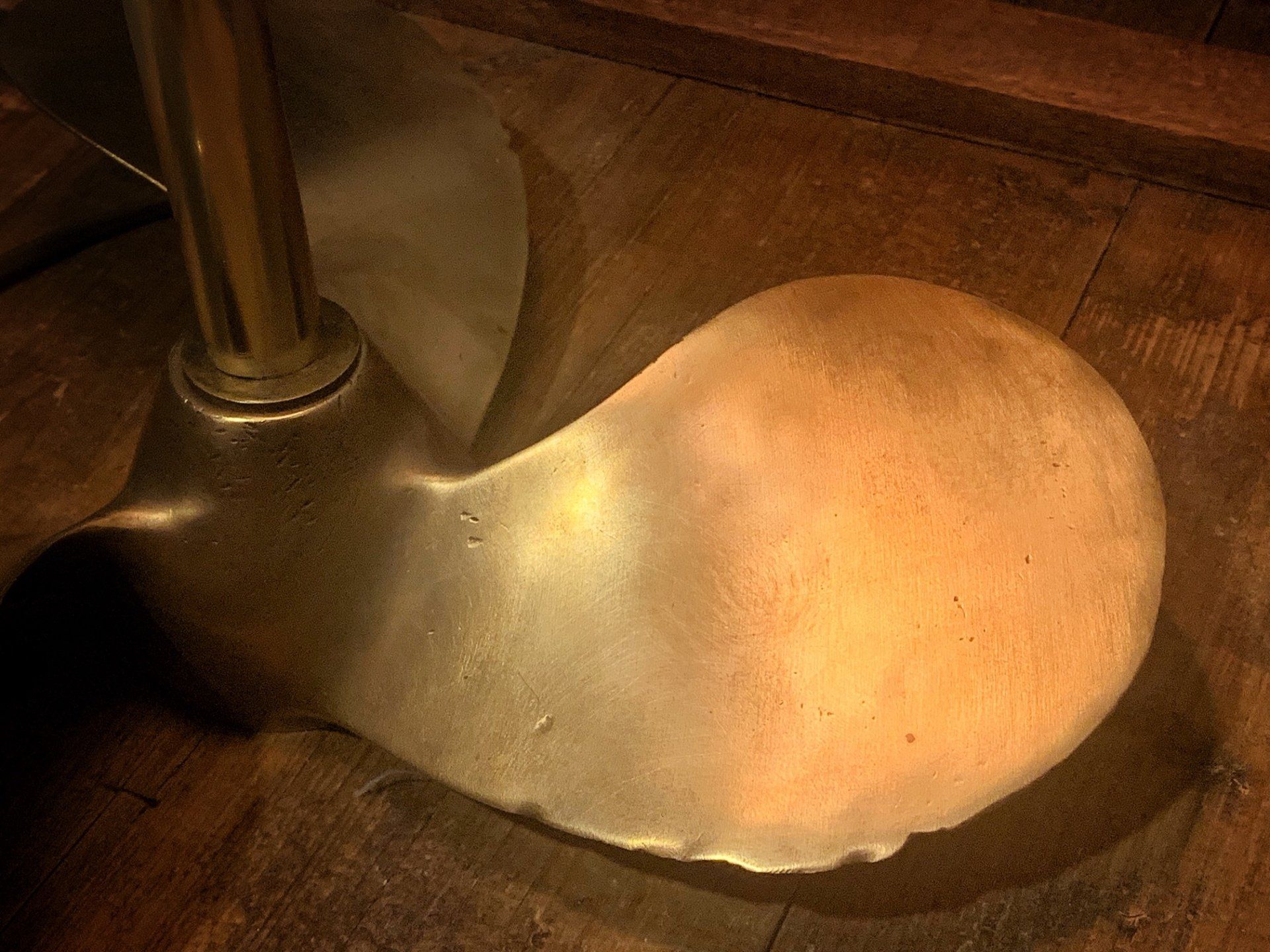 Unsere Tischleuchte trägt einen Schirm aus goldfarbenen Blättern, die sich zu einer Artischocke formen. Der Fuß besteht aus Bronze und Messing, ist fein poliert, trägt aber auch die Spuren der Zeit in Form einer herrlichen Patina. Kerben an den Propellerflügeln zeugen von einem offensichtlich recht bewegten Leben auf dem Wasser.