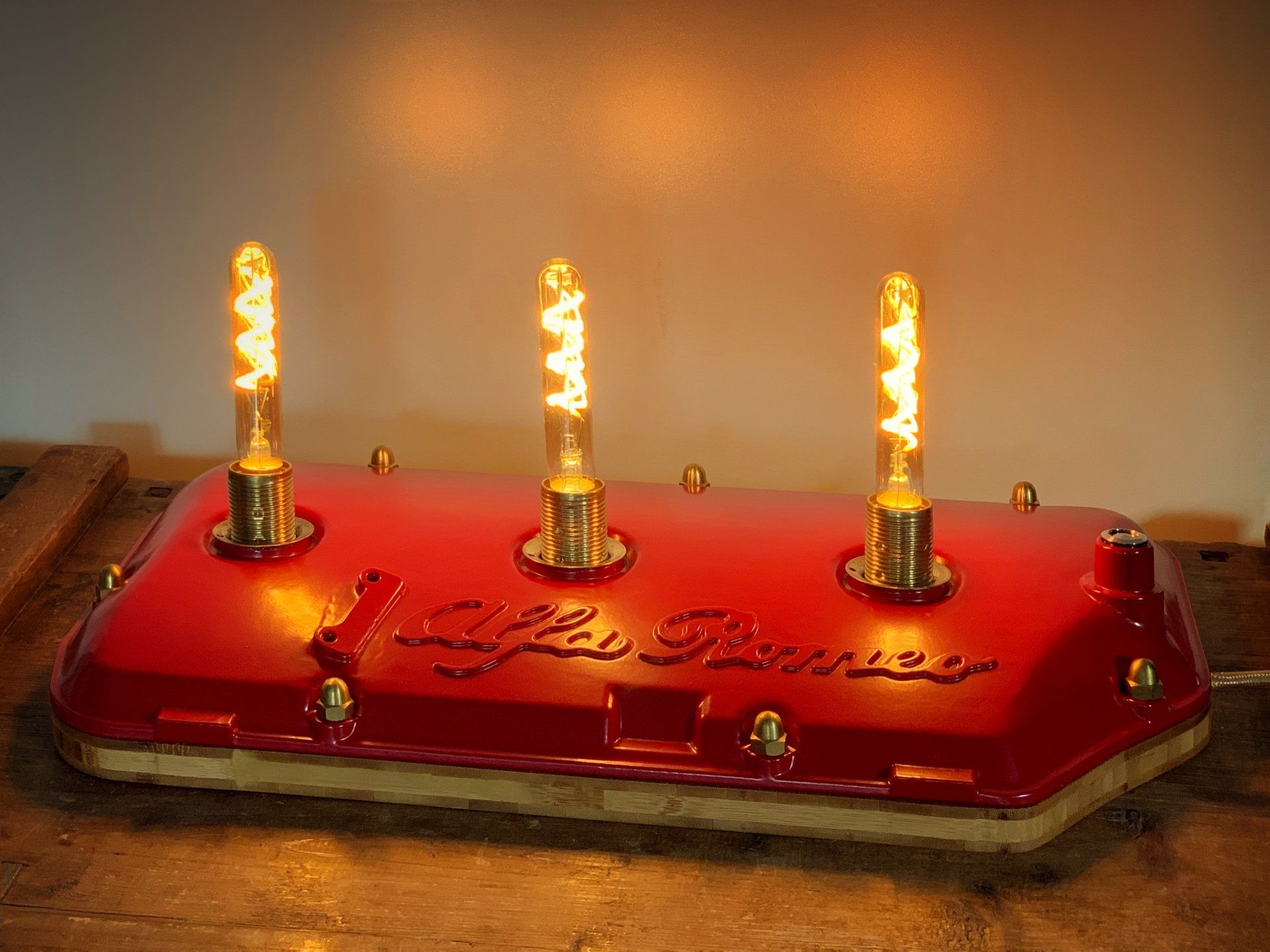 Aus dem Ventildeckel eines Alfa Romeo GTV Spider 3.0 V6 haben wir diese ungewöhnliche Leuchte gebaut. Der Deckel wurde im klassischen Alfa-Rot pulverbeschichtet, so dass der Schriftzug optimal zur Geltung kommt. Montiert wurde er auf einem dicken Brett aus Bambusholz. Die typisch-lebhafte Zeichnung des Holzes zieht sich nun auf einem 18mm breiten Sockel rund um das Leuchtobjekt.
