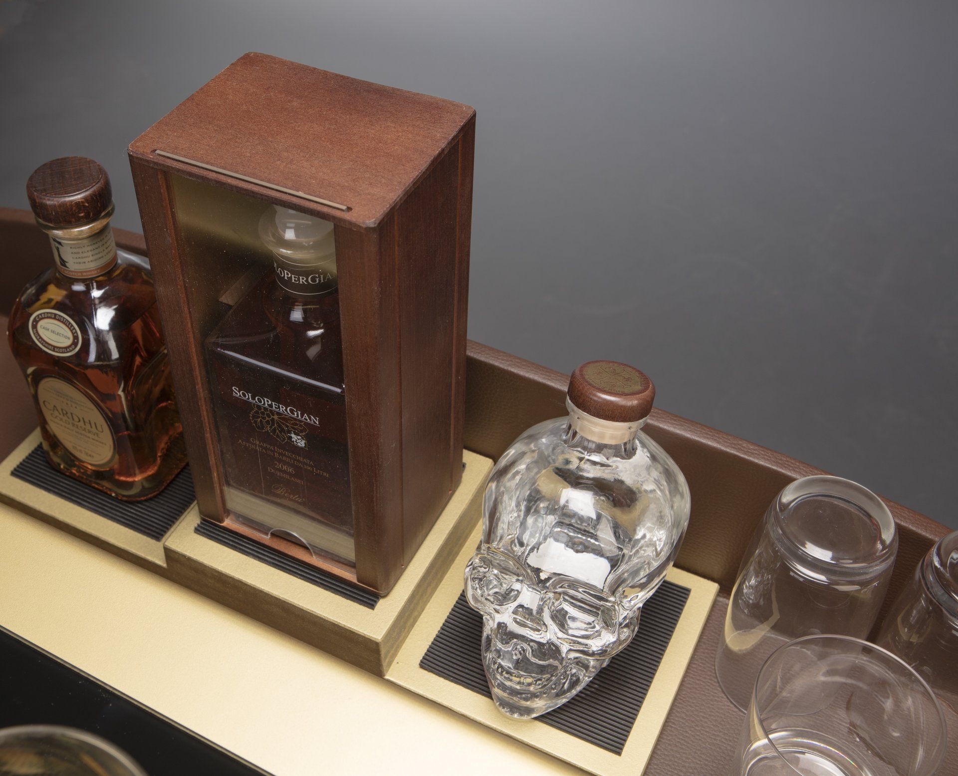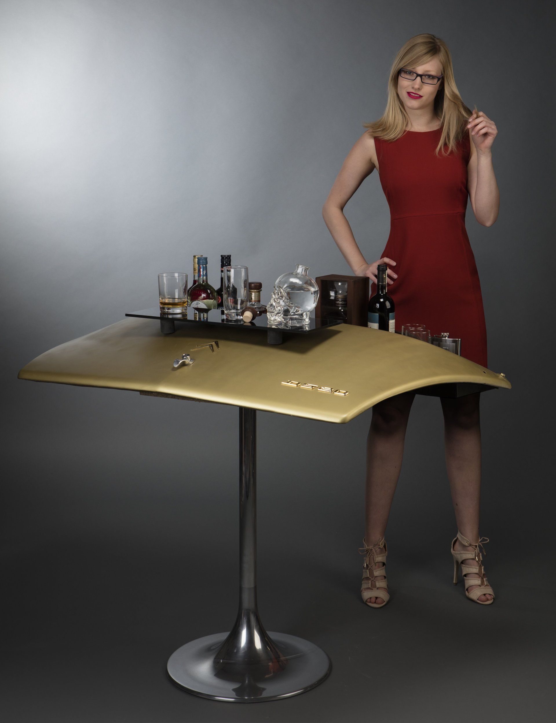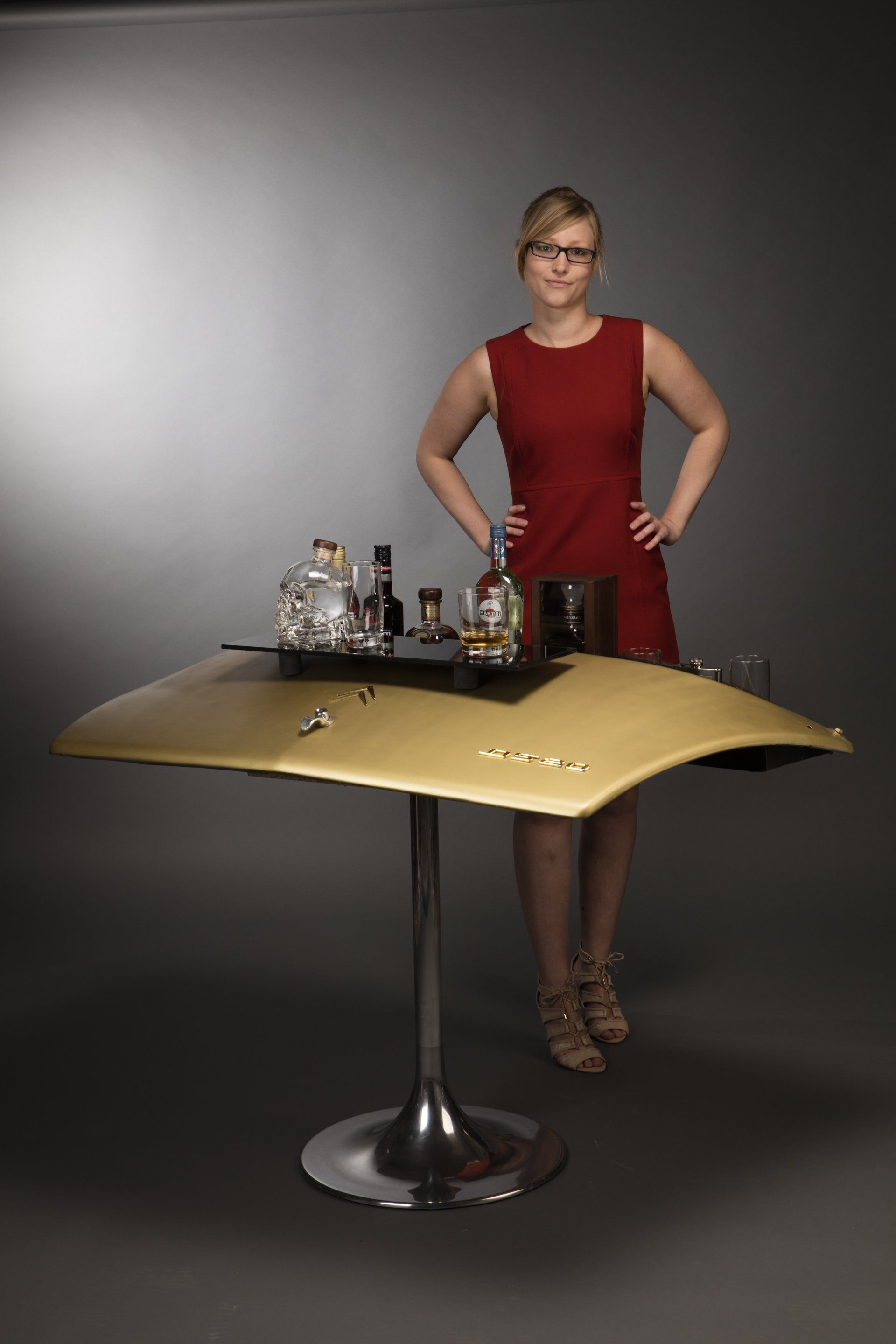 Wo sich am Auto allerdings die Heckscheibe und die Hutablage an die Heckklappe anschließen, haben wir eine versenkte Plattform mit Platz für ca. 15 Flaschen und diverse Gläser geschaffen. Mit einem geschwungenen Heckspiegel, der sich perfekt der Rundung der Heckklappe anpasst. Die Barfläche ist mit feinem, braunem Kunstleder bespannt. Kleines Zusatz-Gimmick: Auf einem goldenen "Sieger-Podest" können Sie Ihre persönlichen Cocktail-Kreationen oder die drei Top-Drinks des Abends präsentieren.