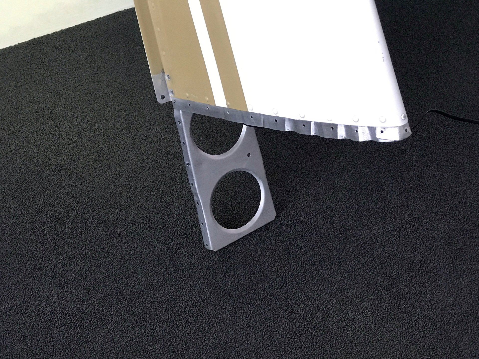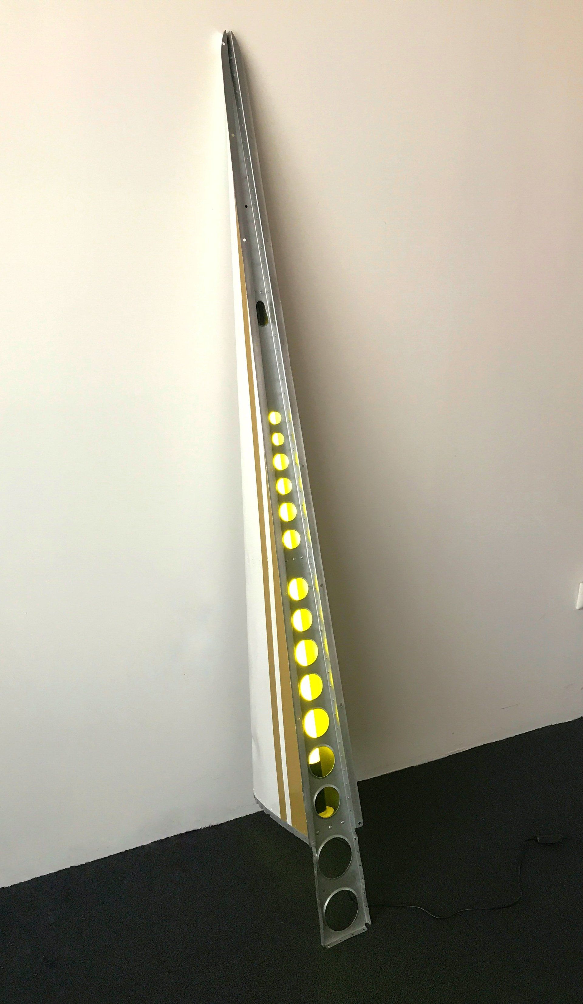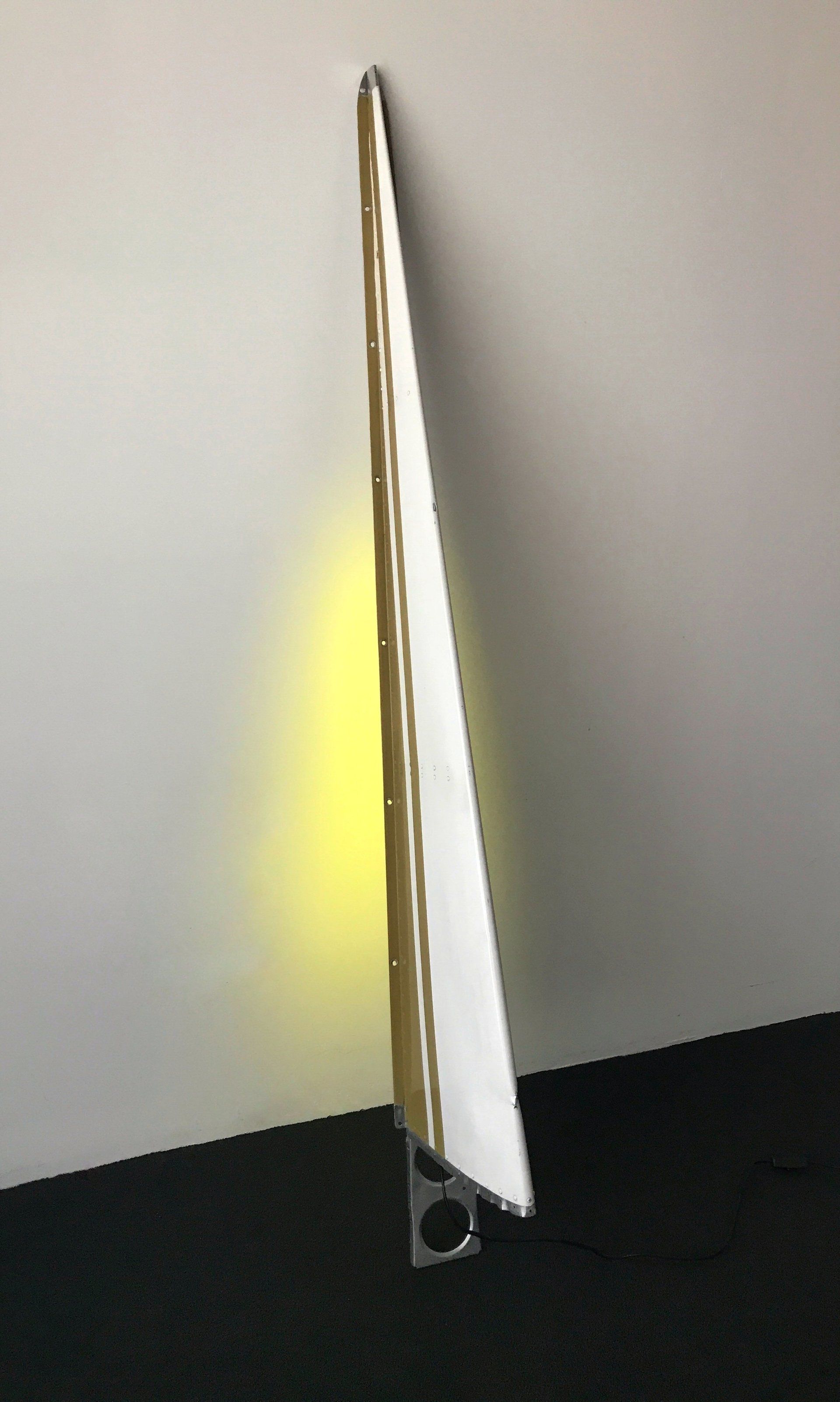 Das Flügelteil stammt von einem Piper-Sportflugzeug, ist pfeilschmal und sehr elegant. Wir haben es in der Original-Lackierung Cremeweiß mit ockerfarbenen Zierstreifen belassen. Alle scharfen Kanten haben wir handschmeichlerisch abgerundet und anschließend gebürstet. An diesen Stellen liegt das glänzende Flugzeugaluminium frei.