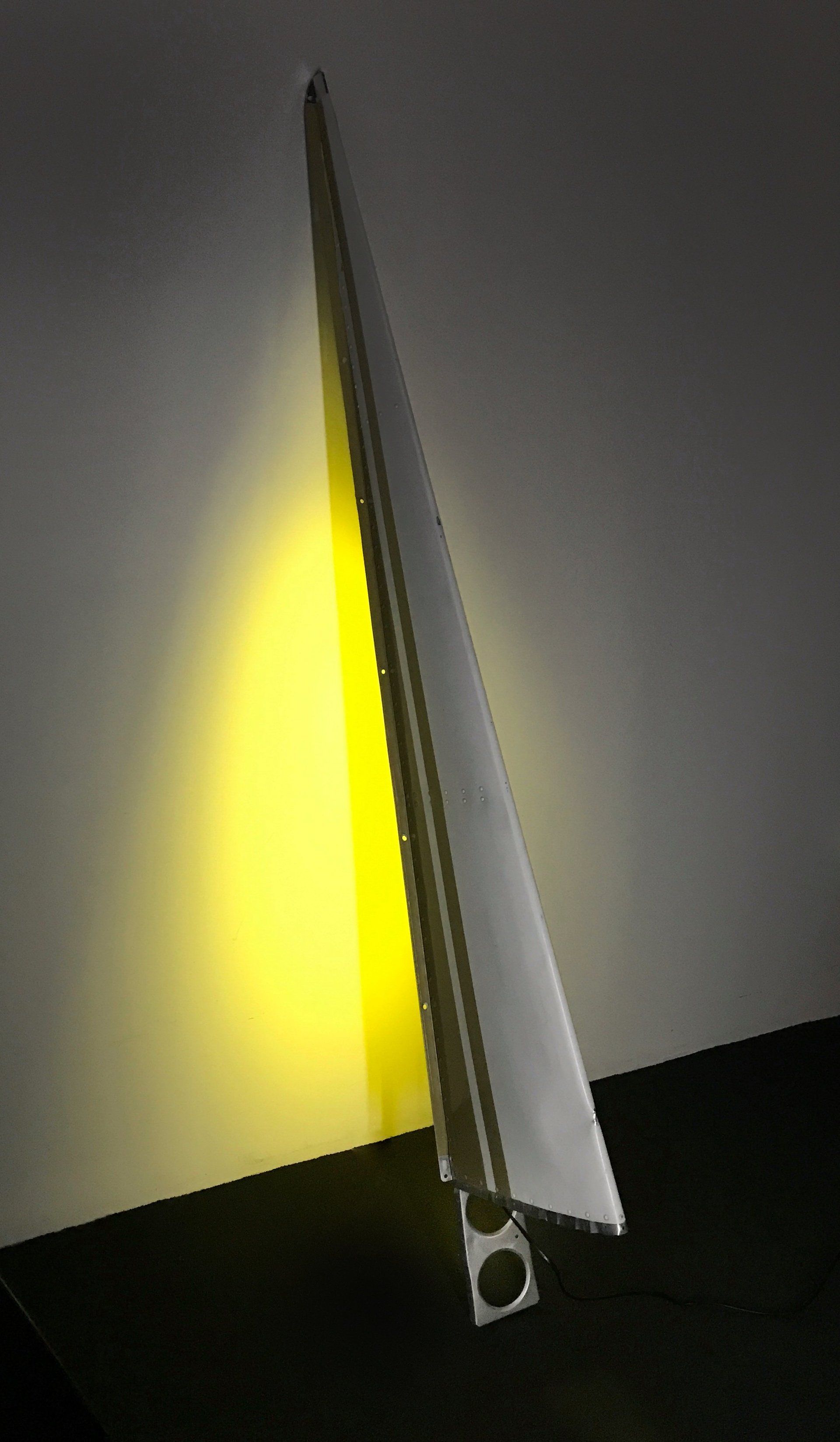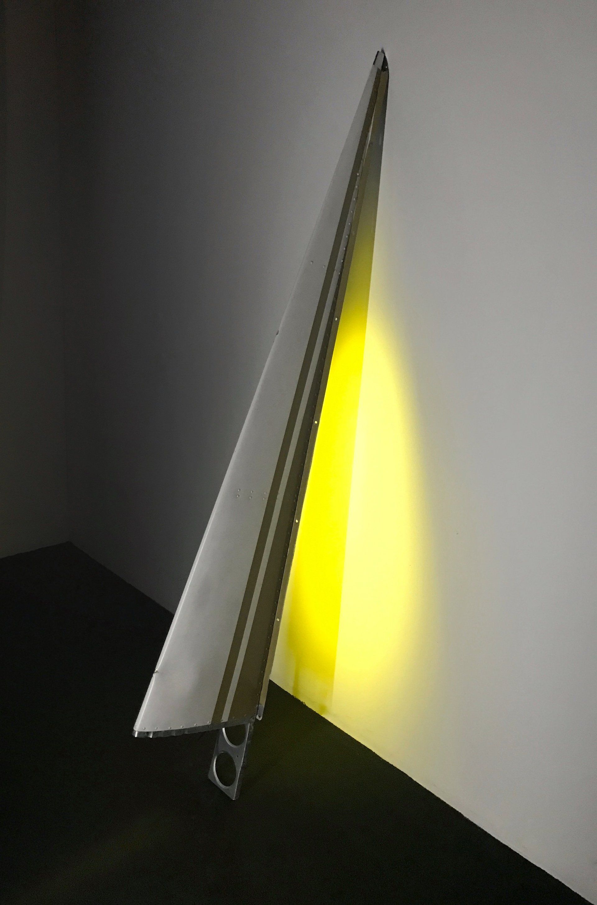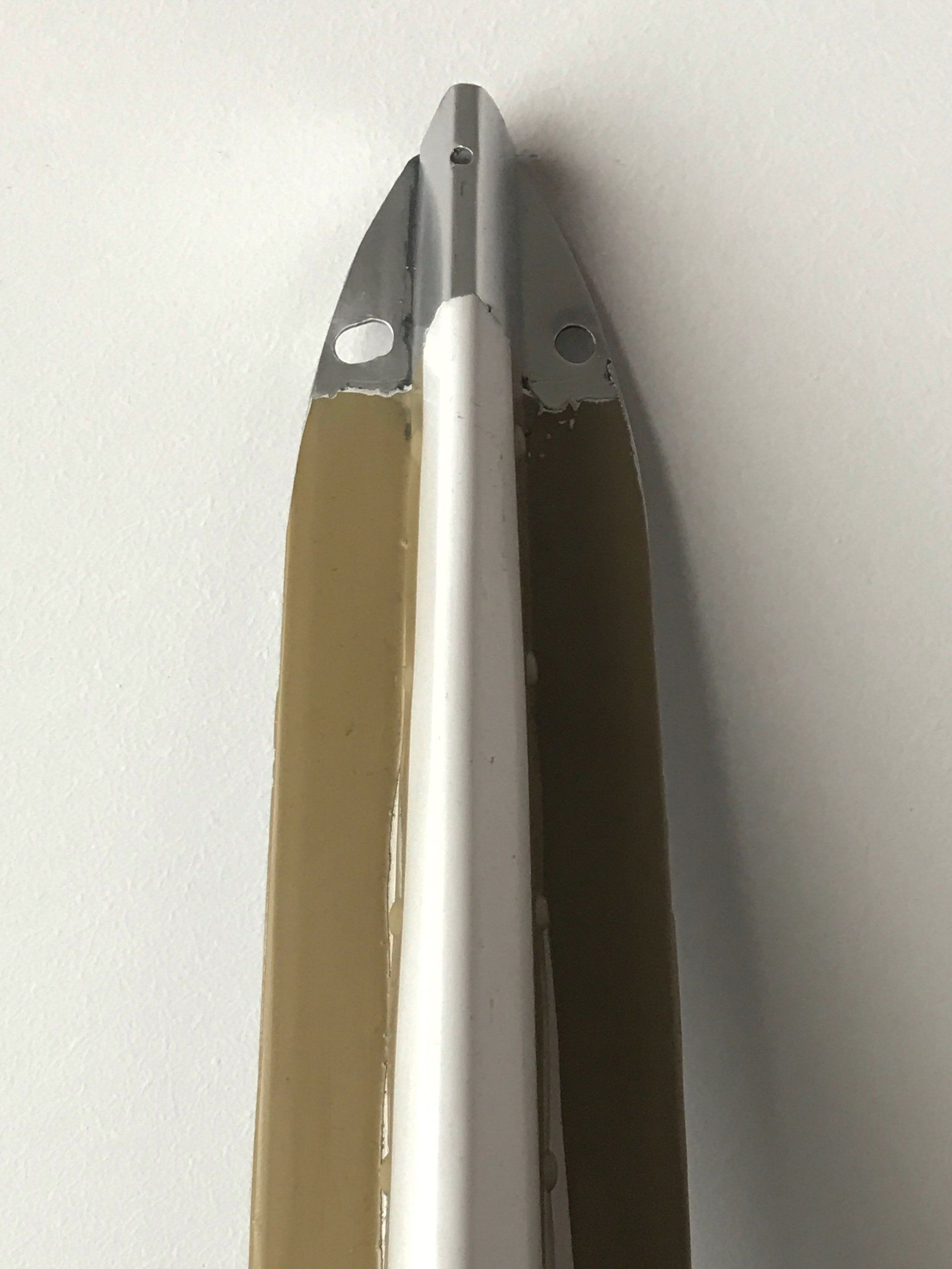 Das Flügelteil stammt von einem Piper-Sportflugzeug, ist pfeilschmal und sehr elegant. Wir haben es in der Original-Lackierung Cremeweiß mit ockerfarbenen Zierstreifen belassen. Alle scharfen Kanten haben wir handschmeichlerisch abgerundet und anschließend gebürstet. An diesen Stellen liegt das glänzende Flugzeugaluminium frei.