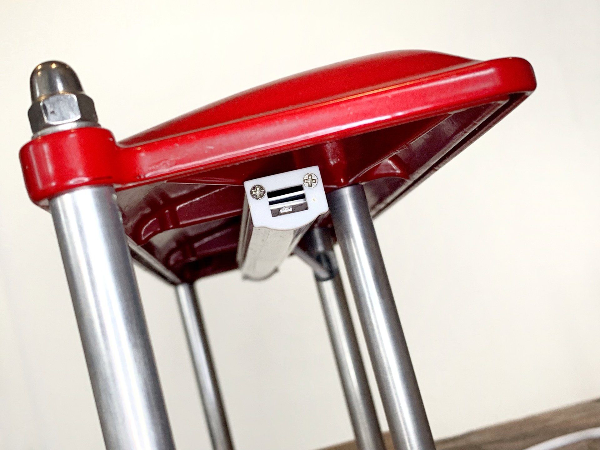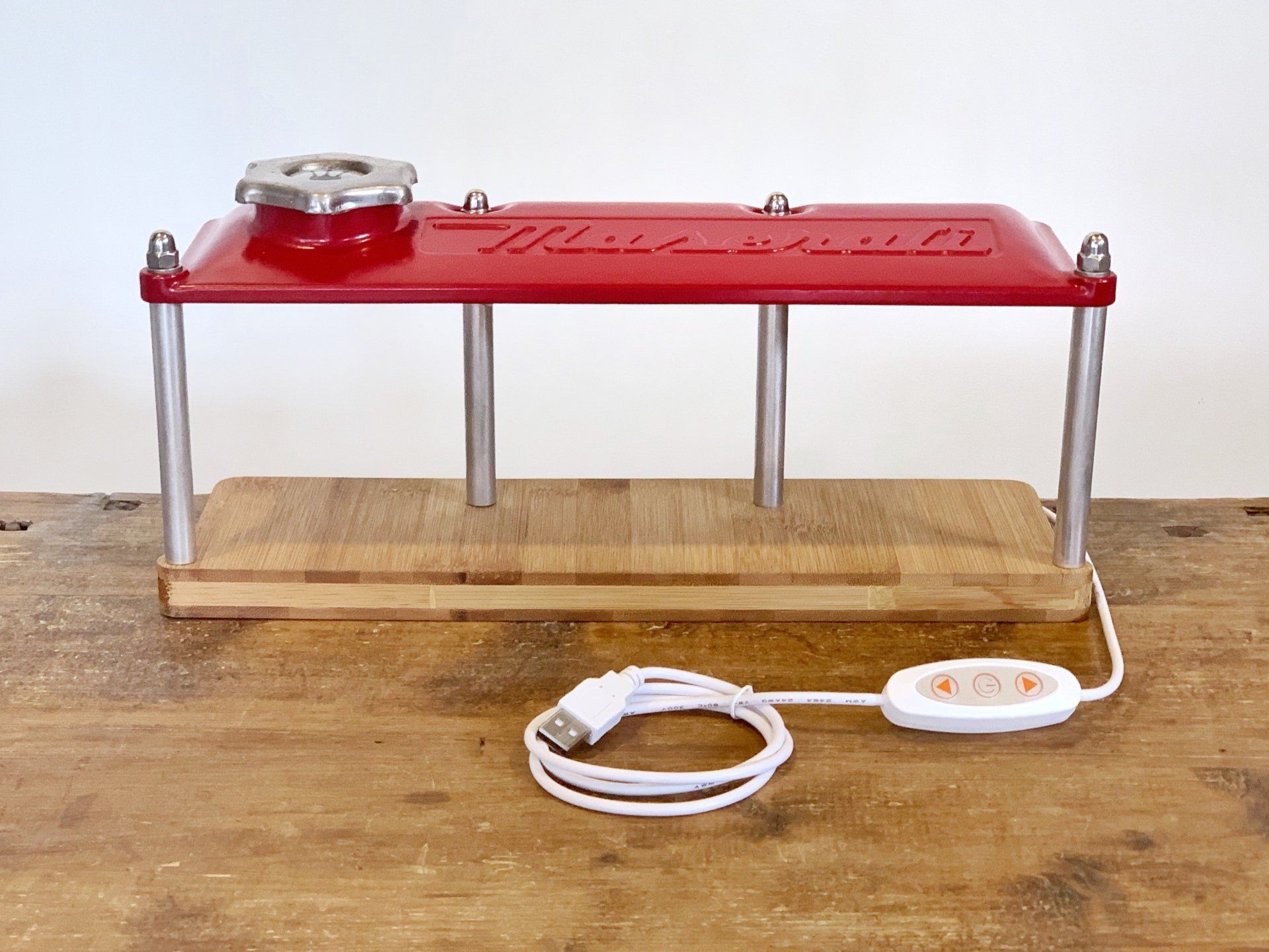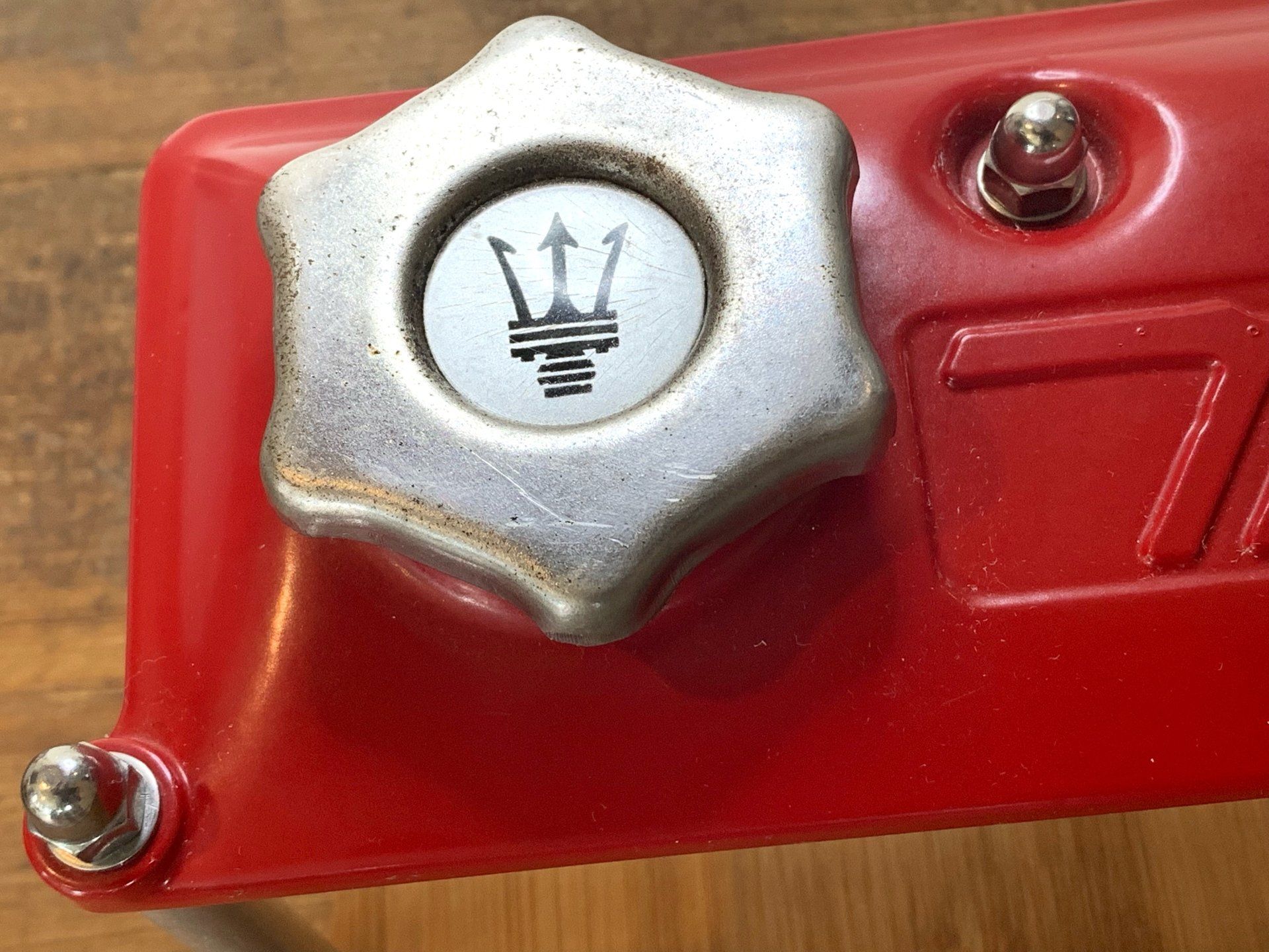 Aus dem Ventildeckel eines Maserati Biturbo haben wir diese ungewöhnliche Schreibtischleuchte gebaut. Der Deckel wurde in Maserati Rosso pulverbeschichtet, so dass der Schriftzug optimal zur Geltung kommt. Der abnehmbare Edelstahl-Schraubdeckel mit dem originalen Maserati-Dreizacklogo zeigt eine schöne Patina.