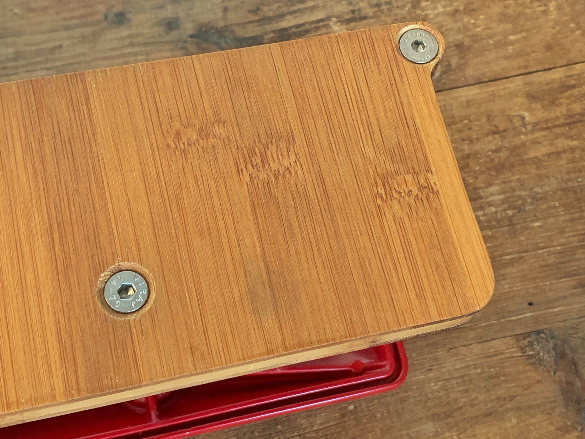 Der Deckel steht auf vier gebürsteten Aluminiumsäulen, die ihn mit einem formgeschnittenen Boden aus Bambusholz verbinden. Die typisch-lebhafte Zeichnung des Holzes zieht sich nun auf einem 18mm breiten Sockel rund um das Leuchtobjekt.