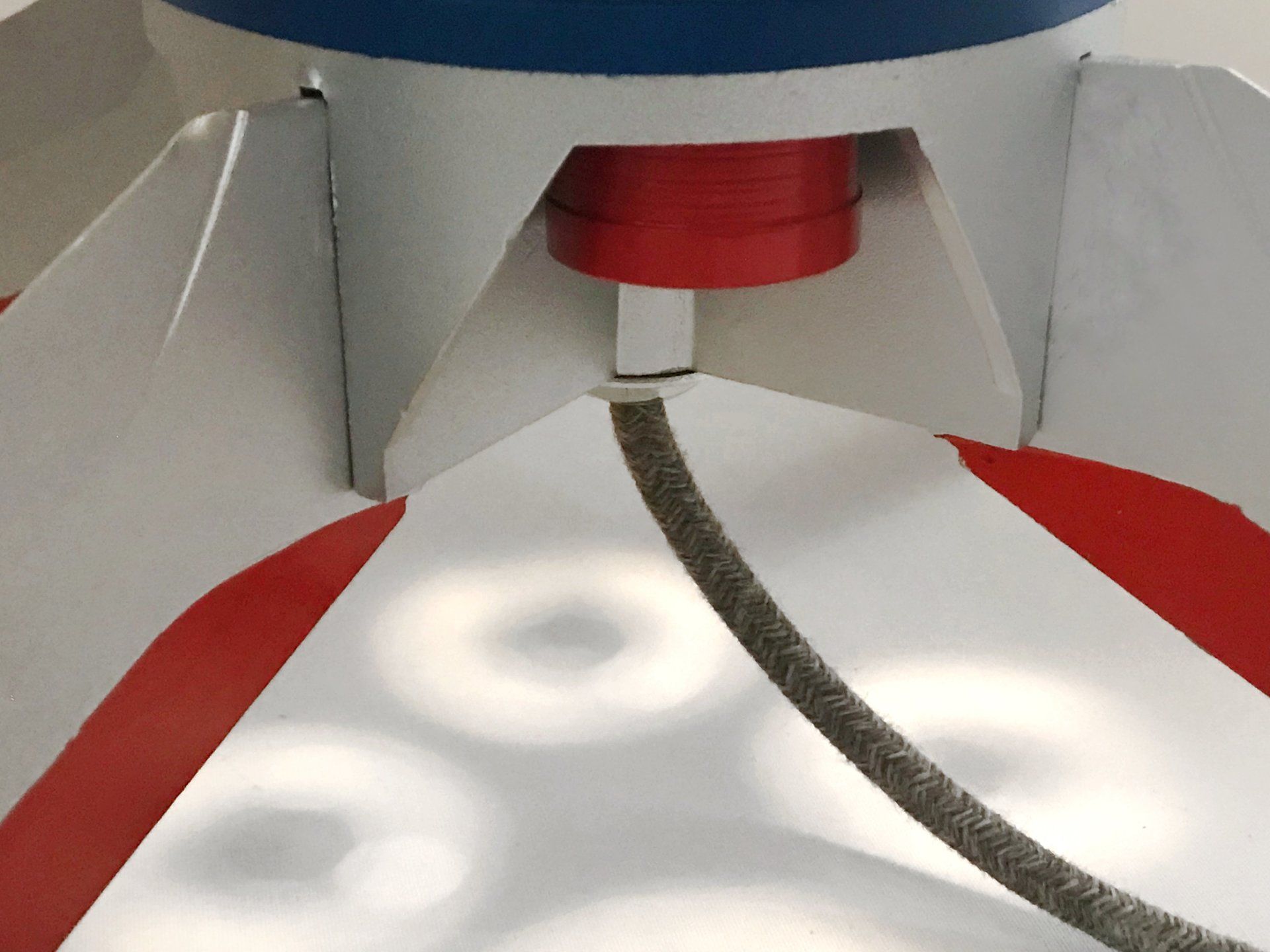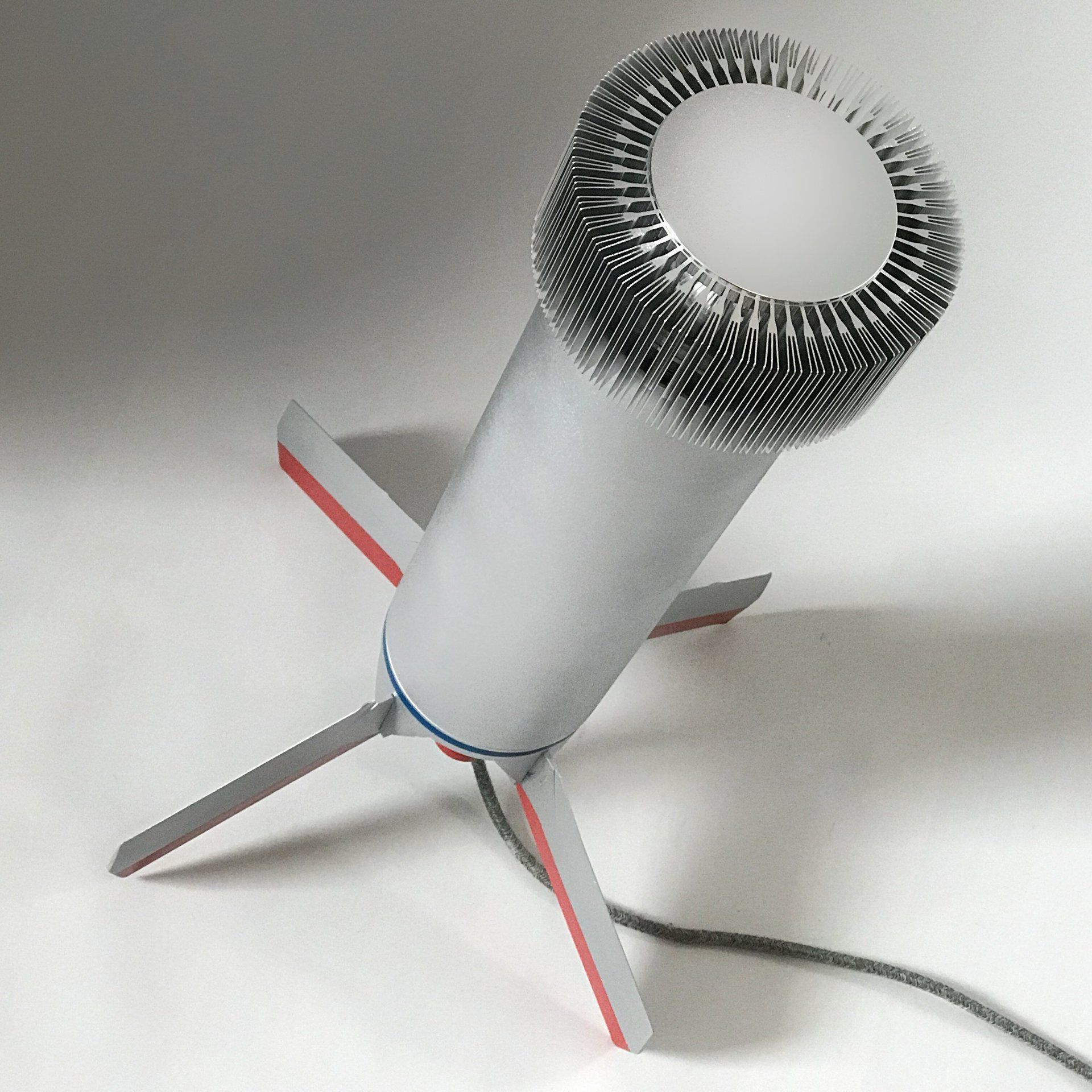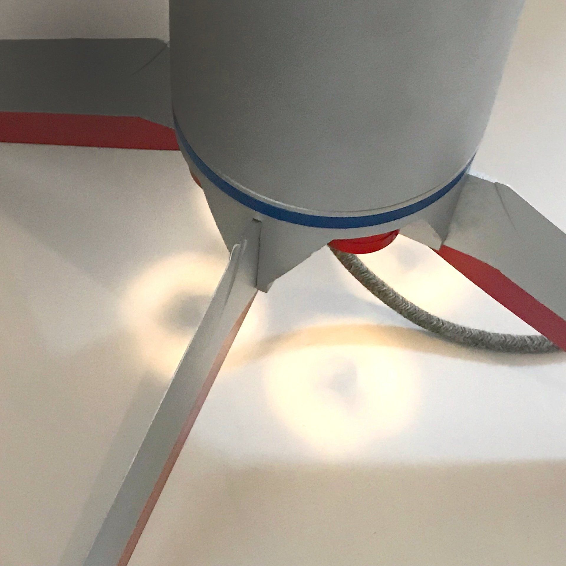 Als Stehleuchte darf sie nun am Boden "gut Wetter machen". Sorgfältig gesandstrahlt und neu lackiert, steht sie auf den original erhaltenen (klappbaren) Leitwerken und wurde im Innern mit einer E27-Fassung versehen. Sie haben daher bei der Auswahl des Leuchtmittels alle Freiheiten. Auf den Boden wirft die "Meteor" durch die vier Triebwerksdüsen hindurch ein interessantes Lichtmuster aus vier Ringen – je einer pro Triebwerk. So als ob die Rakete im nächsten Moment abheben würde.