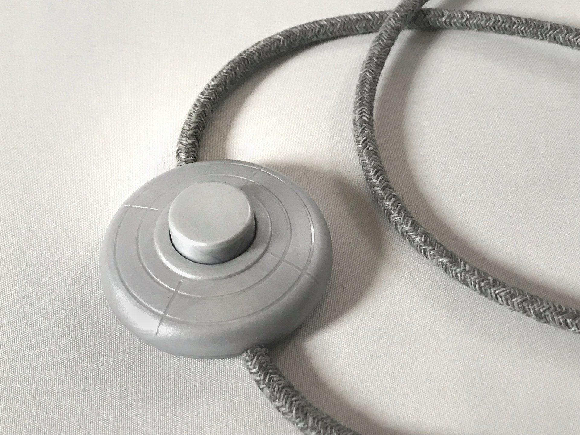 Beide Versionen haben ein hochwertiges, textilummanteltes Stromkabel mit Fußschalter, stimmig in Grau gehalten. Das Kabel wird unten mittig aus der Leuchte herausgeführt.