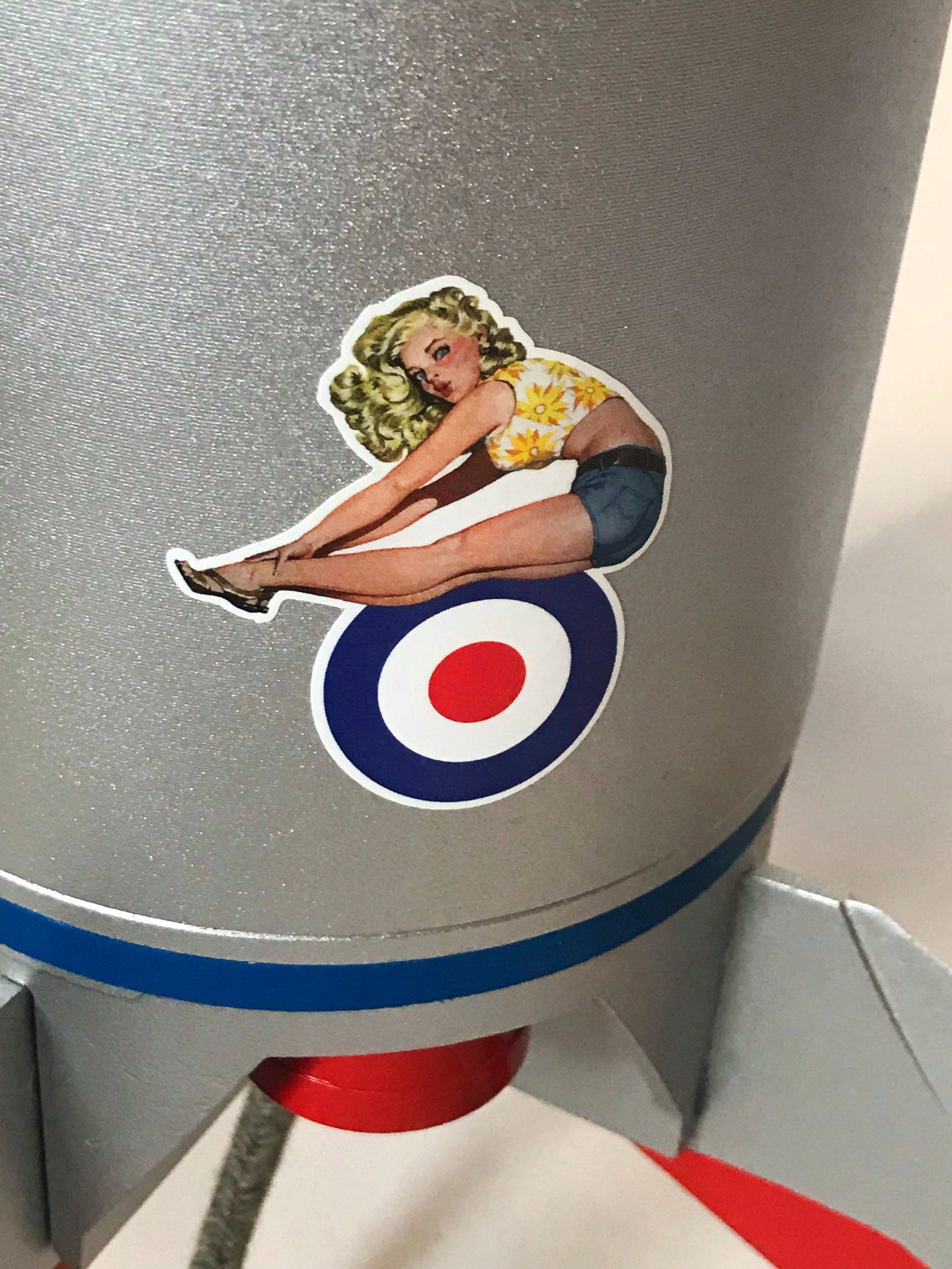 Die "Meteor" bieten wir in zwei Versionen an: Die Kappe der Stehleuchte, die aus massivem Aluminium gefräst wurde, ist entweder komplett unlackiert oder zweifarbig rot und blau. Die zweite Version (Aufpreis 80 Euro) trägt am Fuß außerdem ein passendes "Vargas Girl" als Nose Art, ebenfalls in Rot-Blau.