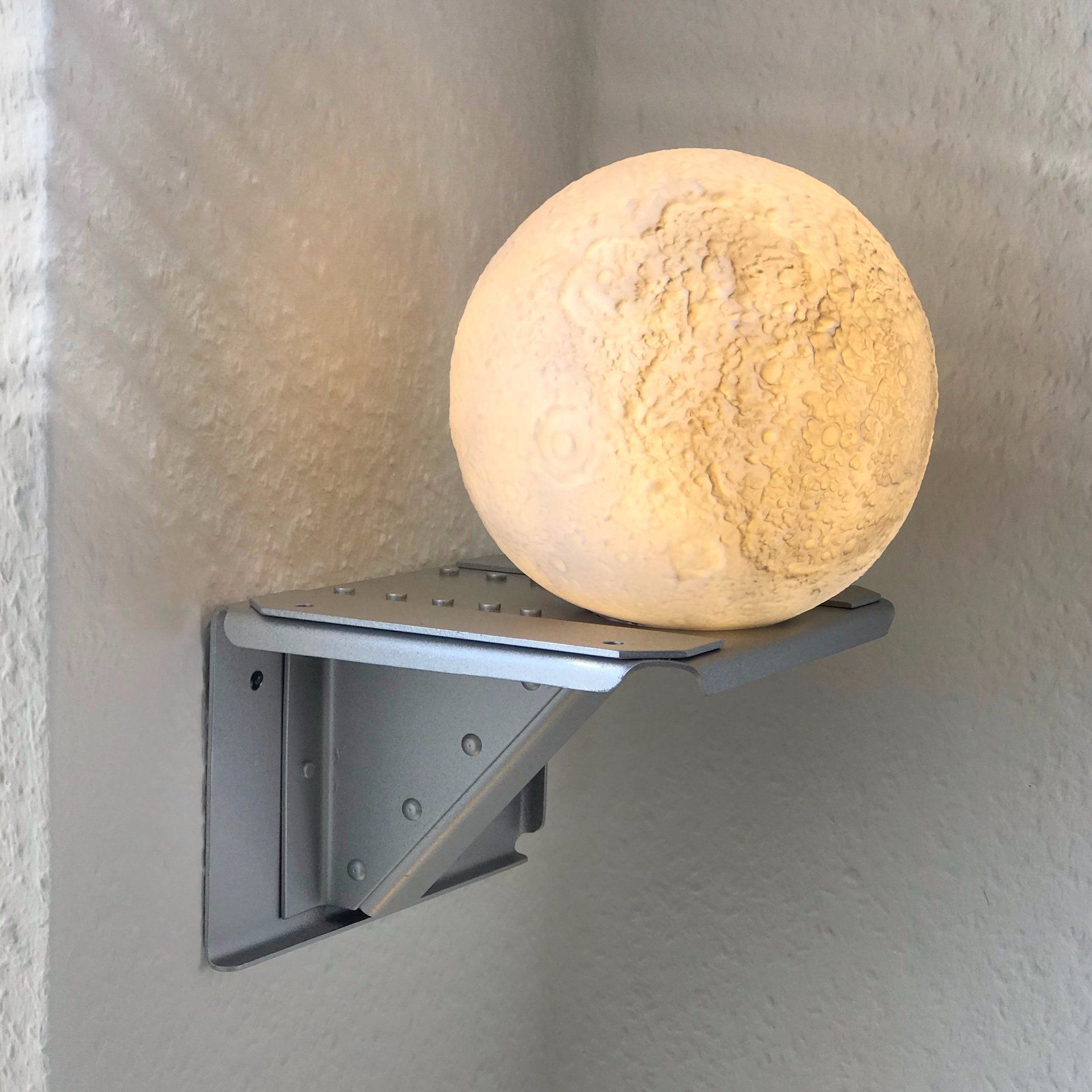 Unsere Halterung aus leichtem Flugzeug-Aluminium ist keine 20 Zentimeter breit und hat oben ein Loch. Damit ist sie wie gemacht für diese ungewöhnliche Leuchte. Die Kugel ist ein sehr detailliertes 3D-Modell unseres Mondes, das die Oberfläche des Erd-Satelliten in feinen und ertastbaren Reliefs abbildet. Der Mond leuchtet wahlweise in drei Farbvarianten – kaltweiß, warmweiß und gelblich. Die Helligkeit lässt sich stufenlos einstellen. Dies alles geschieht über einen einzigen, kleinen Druckknopf auf der Unterseite der Kugel. Die Leuchte hat einen eingebauten Akku und einen Micro-USB-Anschluss.