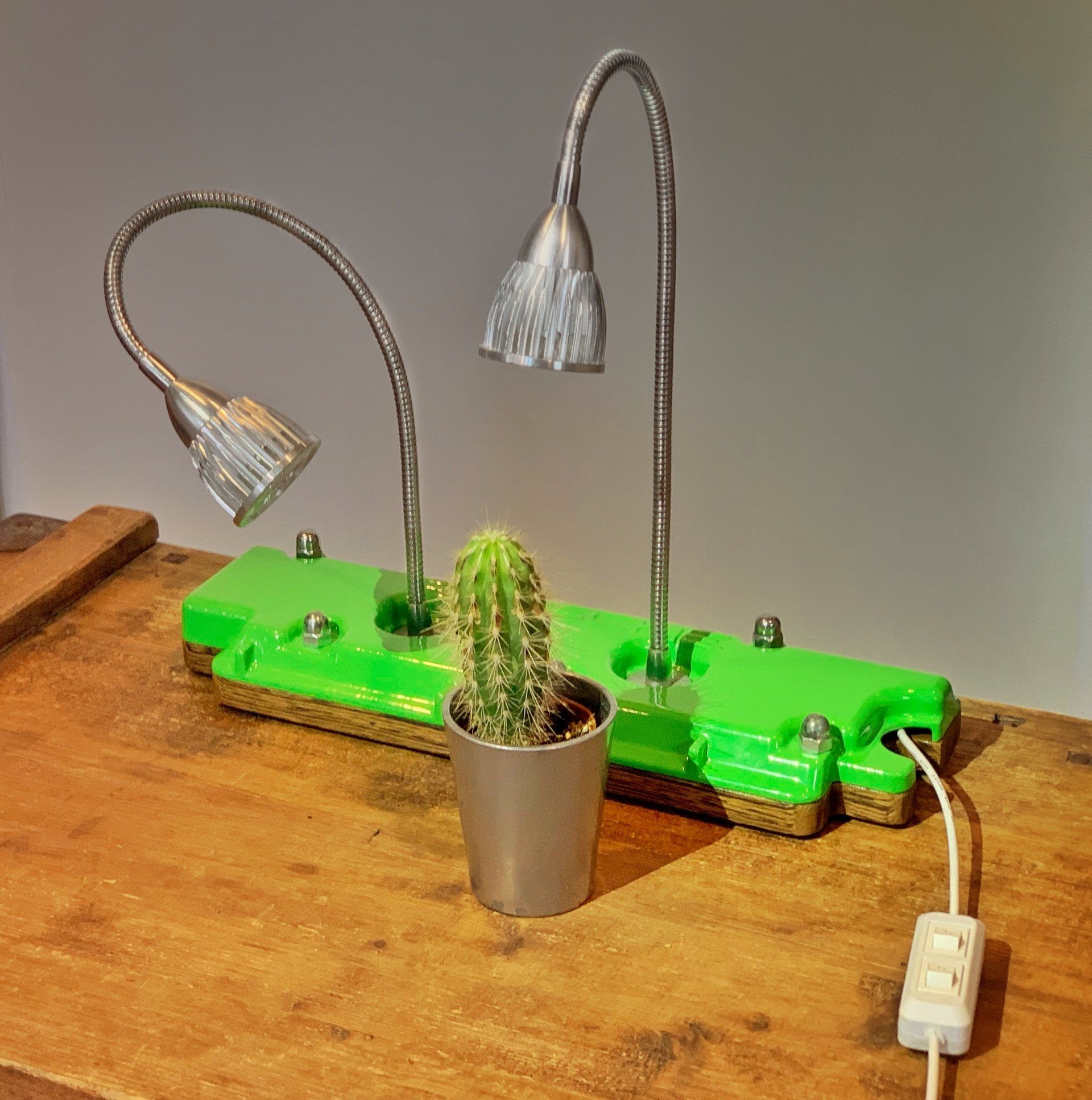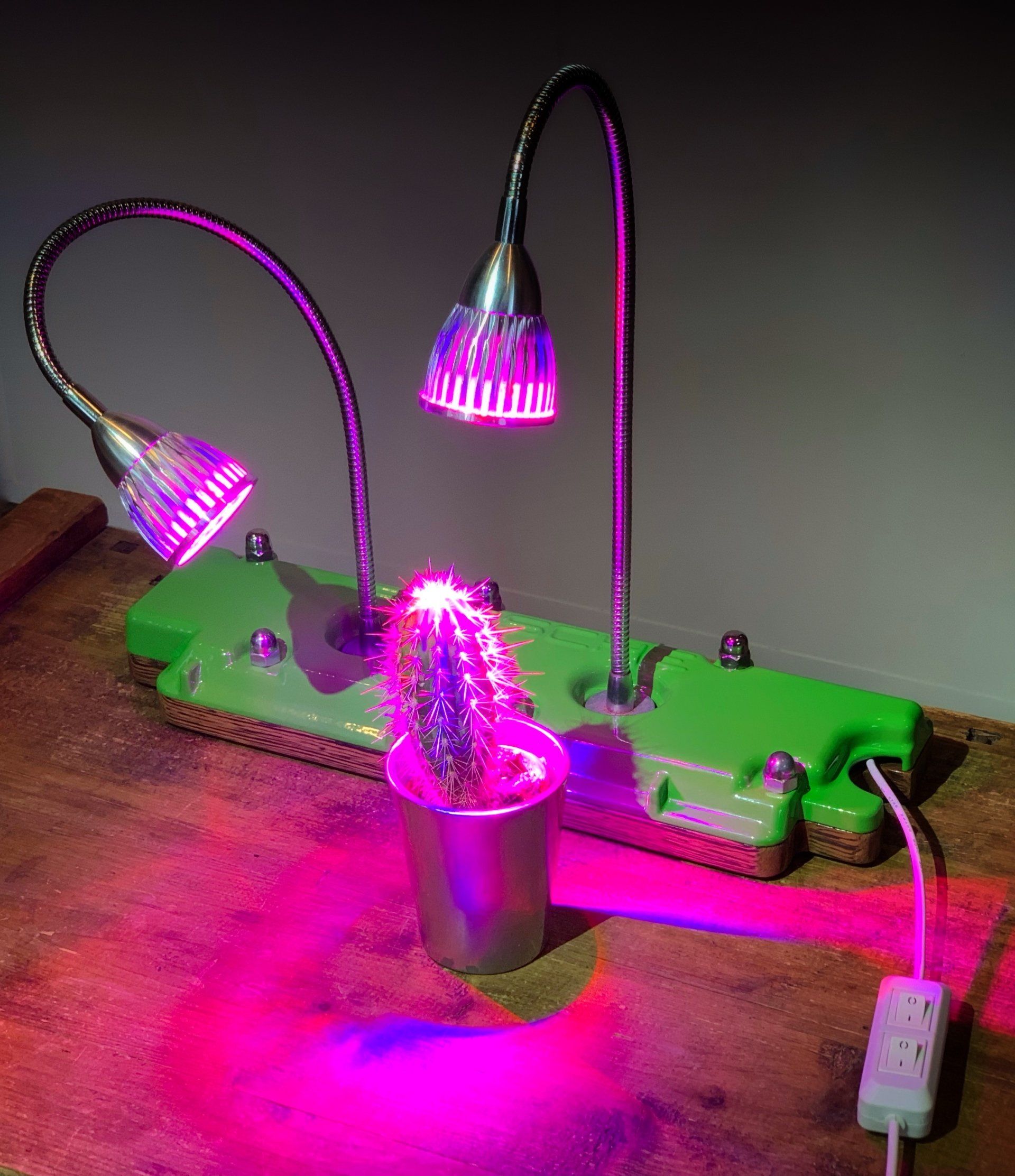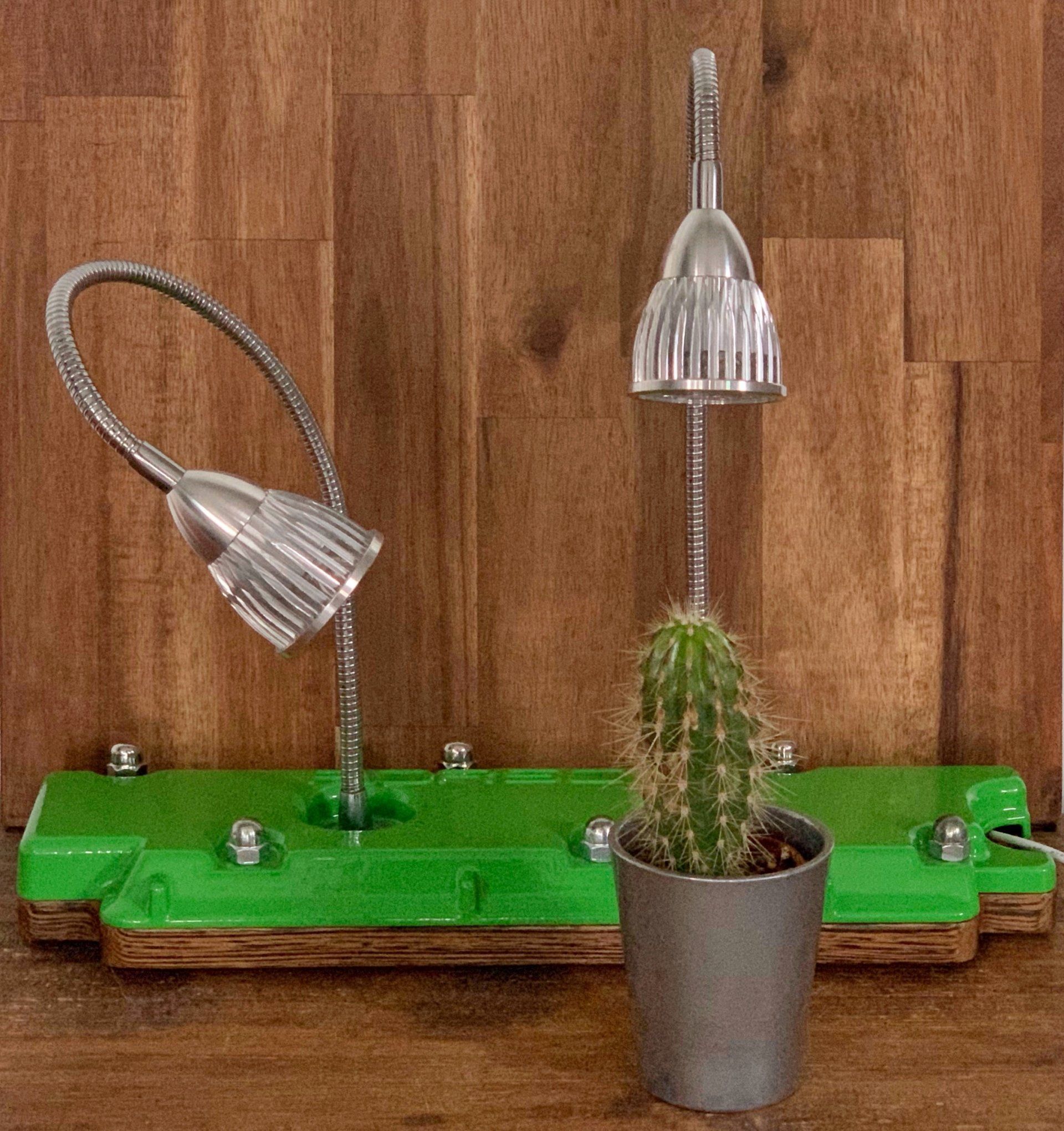 Der Ventildeckel eines klassischen Porsche 911 wird hier zur coolen Planzenleuchte. Er wurde sauber entölt und entlackt, dann pulverbeschichtet im klassischen Elfer-Grün, wie es auch bei den F-Modellen der 911er-Baureihe ab Werk zu haben war. So steht er da, mit zwei herausragenden LEDs aus gefrästem Aluminium, deren Edelstahl-Schwanenhälse frei in alle Richtungen gebogen werden können. Die beiden Leuchten leuchten in der typischen violetten Pflanzenfarbe, wie unsere stummen Florafreunde es so sehr lieben, um per Photosynthese aus Licht eine Rübe zu formen oder eben ein paar Stacheln.