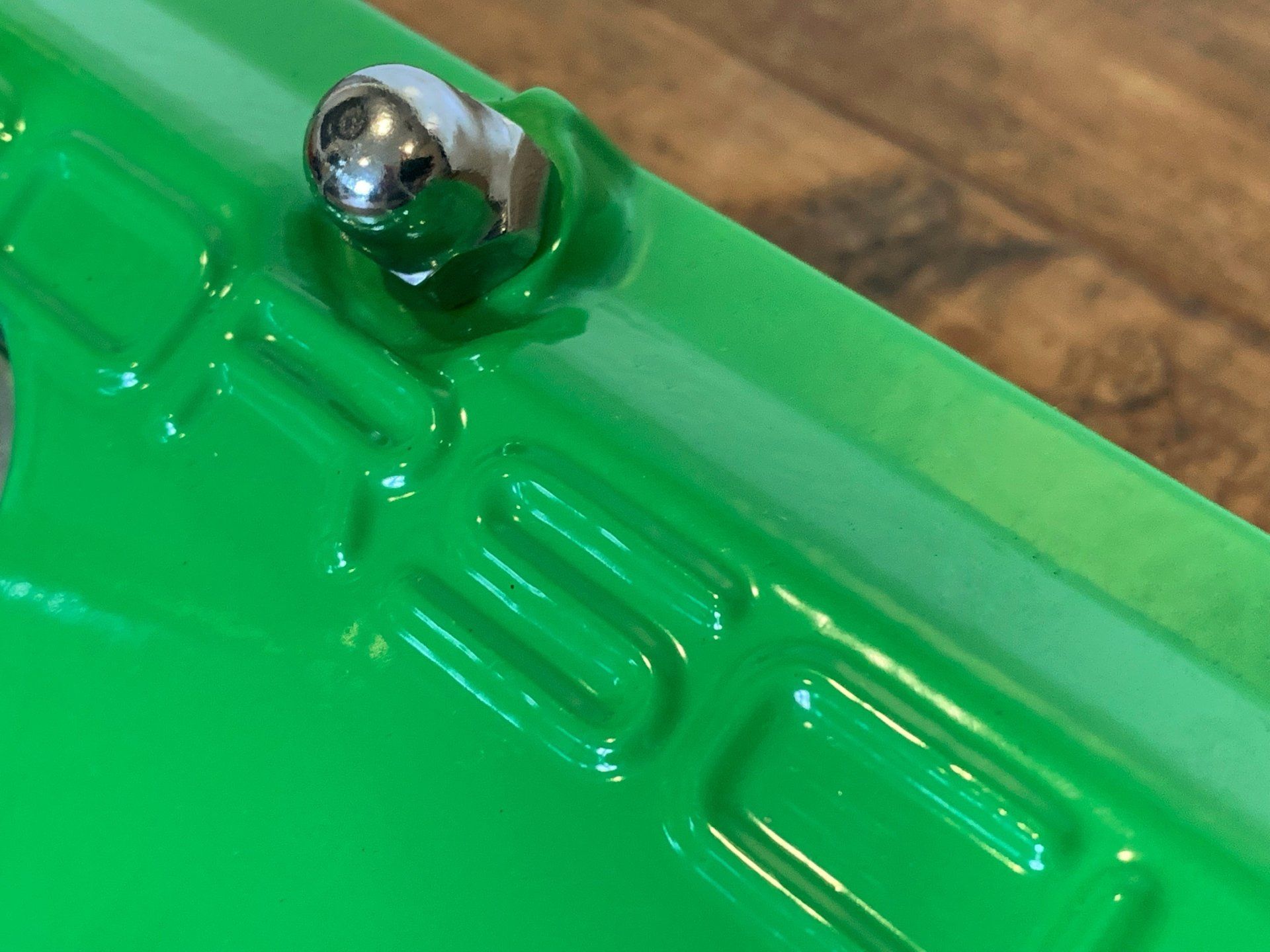 Die beiden LEDs werden über einen Handschalter am Kabel unabhängig voneinander gesteuert. Der Magnesiumdeckel ruht auf einem formgeschnittenen Sockel aus dunklem, edlem Palisander-Holz mit prächtiger Maserung. Verchromte Hutmuttern geben dem grünen Kultdeckel seine brachiale Gärtner-Optik. Besser kann es so ein kleiner Kaktus, wie Sie ihn auf unseren Bildern sehen, ja wohl wirklich kaum erwischen.