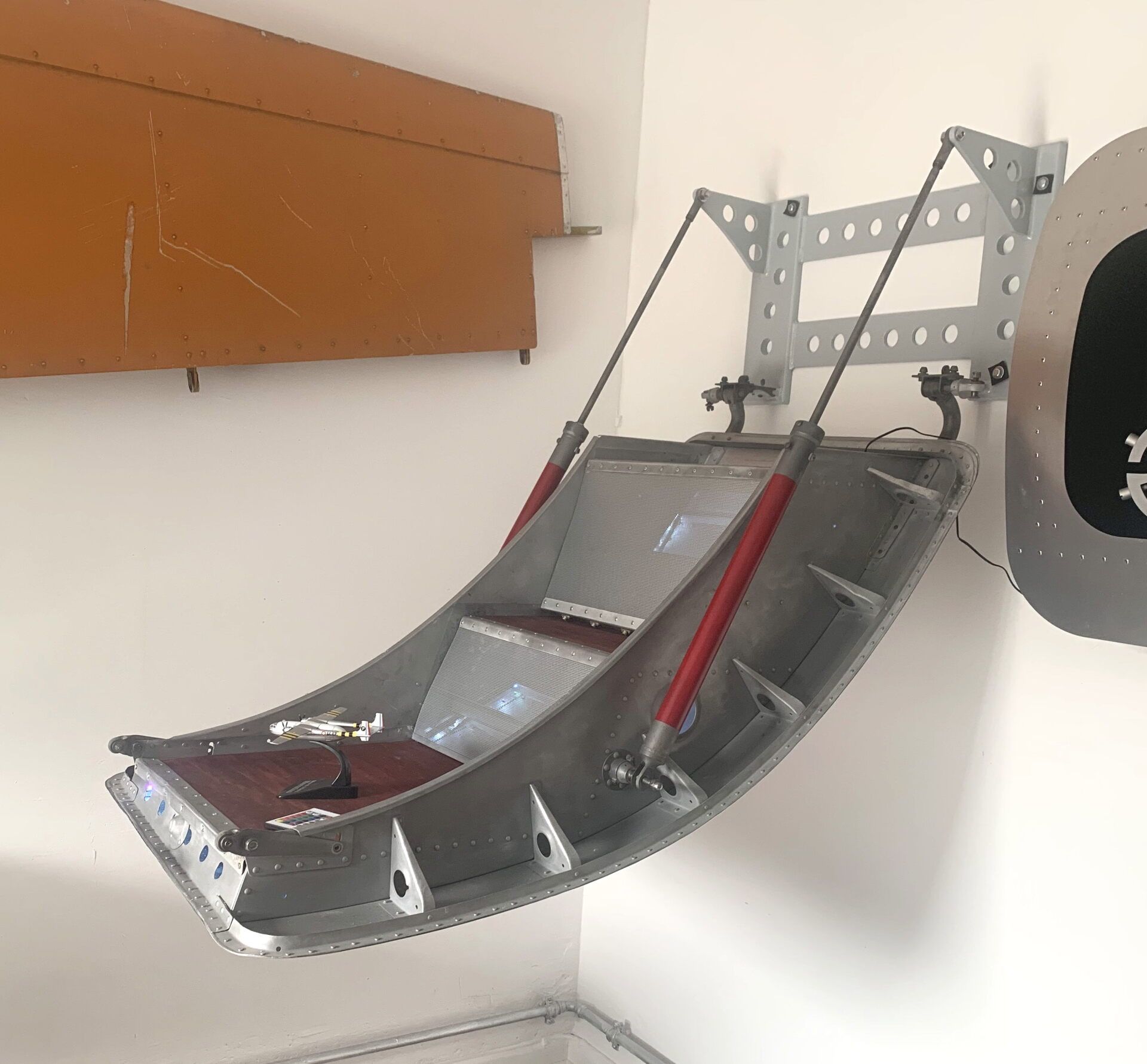 Bitte beachten Sie, dass das Bauteil in sich über mehrere Achsen gebogen und nicht symmetrisch ist. Denn es befand sich am Flugzeug recht weit vorn, wo sich der Rumpf bereits verjüngt. Die maßgeschneiderte Wandhalterung und auch die Aluminiumdome sind jedoch so konstruiert, dass sowohl die Regalböden als auch nach dem Umdrehen die Tischplatte immer perfekt waagerecht sind.