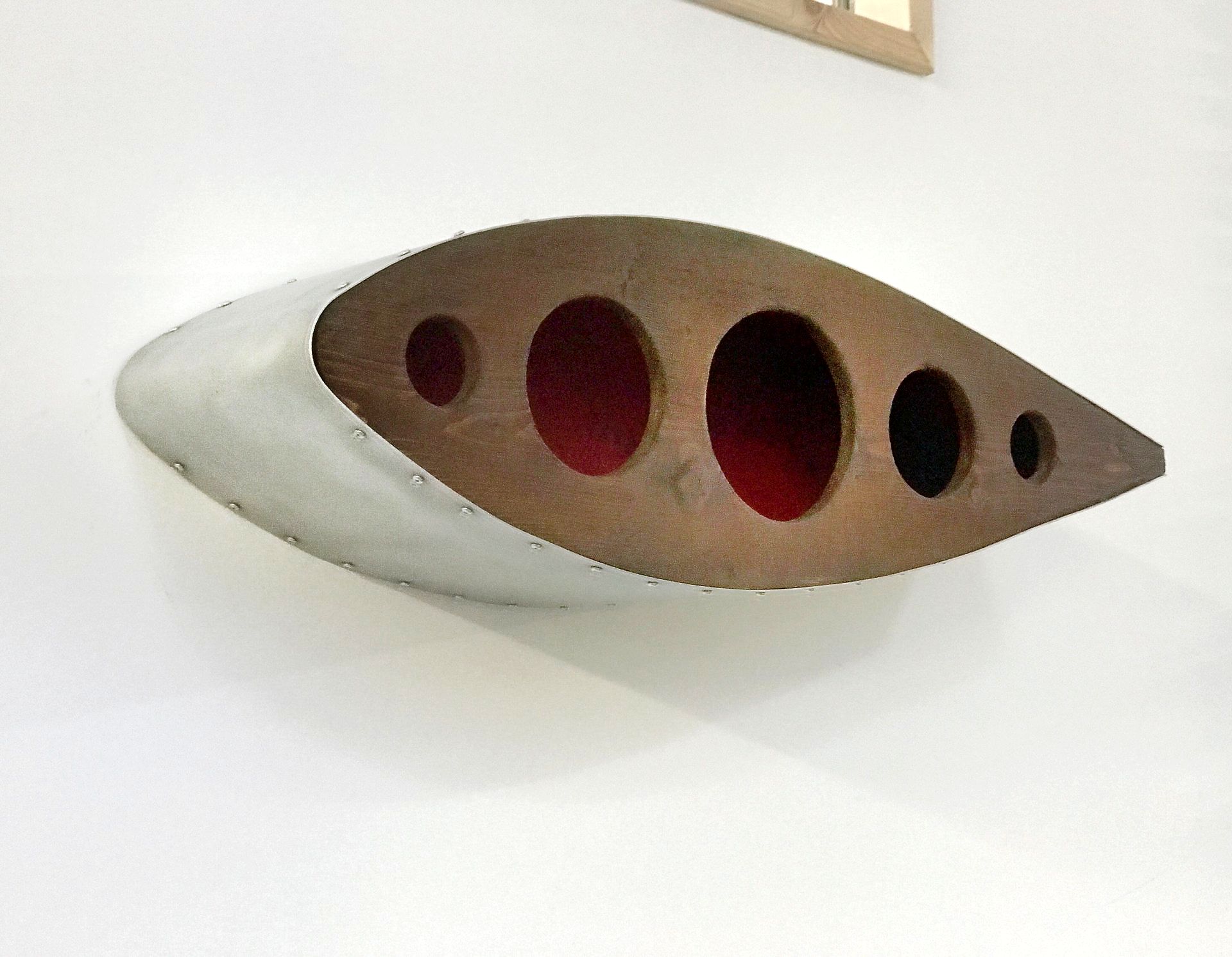 Die Aluminiumhaut unseres Tragflächenelements erhielt anschließend einen feinen Bürstenschilff, das Holz wurde geölt und gewachst. Innen haben wir das Regal rot lackiert. Das passt perfekt zu schwarzen Socken. Ihre Socken sind doch wohl hoffentlich schwarz, oder?