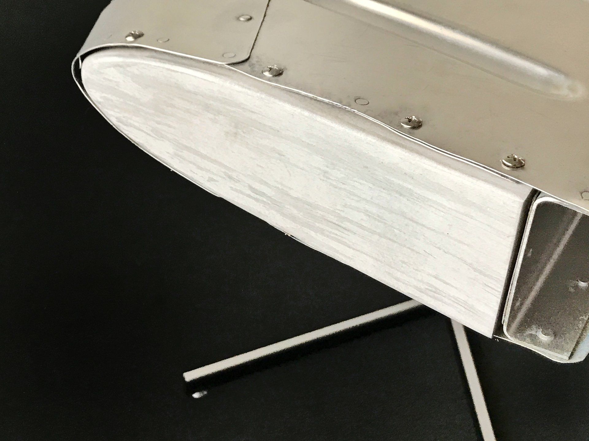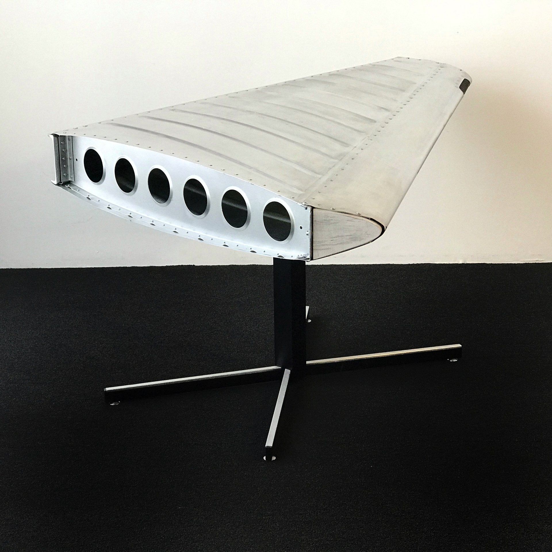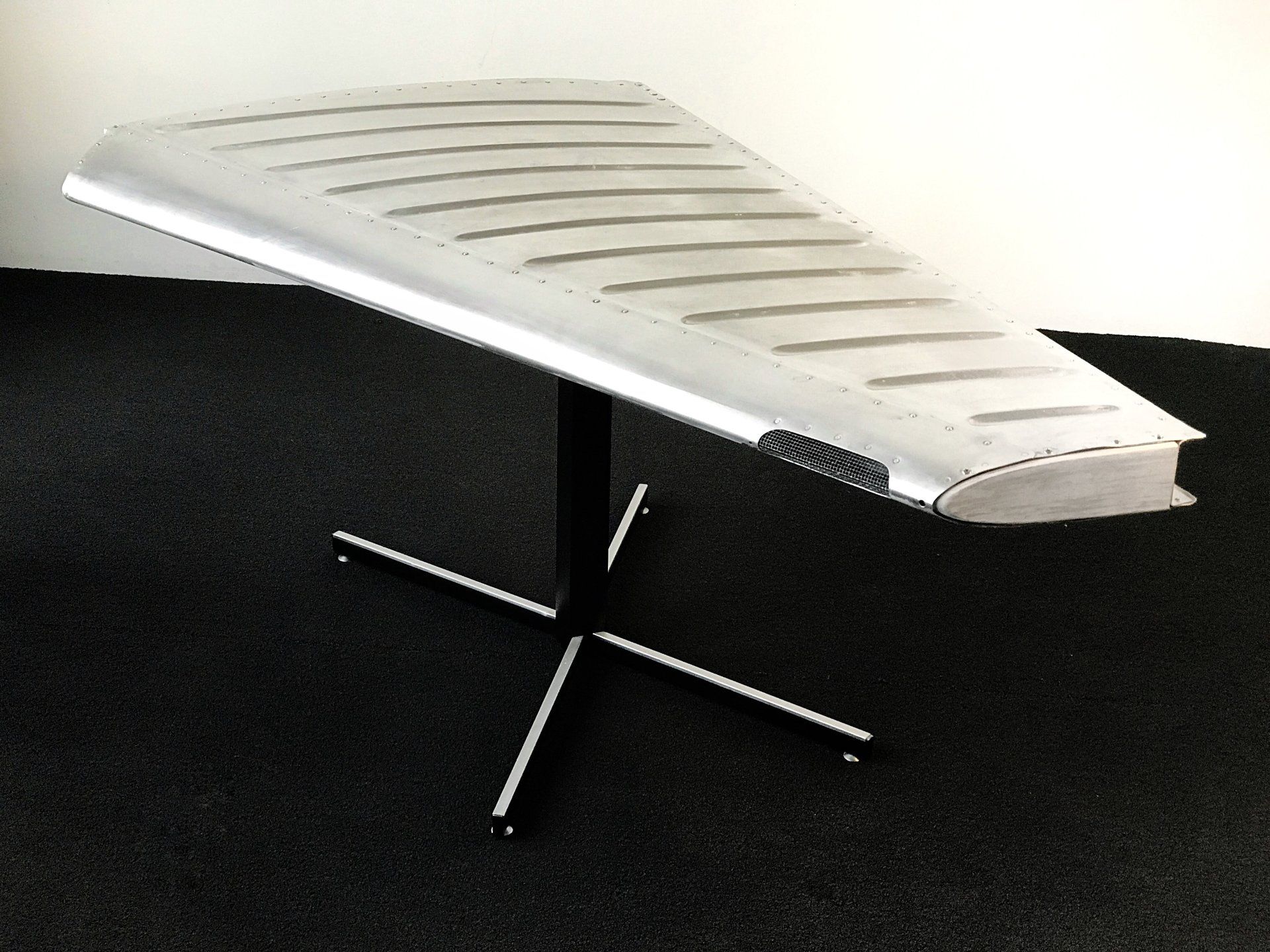 Ähnlich dem Modell "Wingman", jedoch spiegelverkehrt. Es wurde also die, in Flugrichtung gesehen, rechte Seite des Leitwerks als Tischoberfläche gewählt, entlackt und poliert. Auf Wunsch des Kunden haben wir das Leitwerk auf einem Standfuß aus den 1960er-Jahren verschraubt, dessen Stahlteile wir ebenfalls aufgearbeitet haben.
